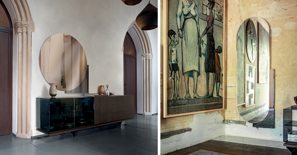 Conosciuto come Pali Kamma, religione e filosofia indiana, il Karma è “l(fā)a legge casuale dell’universo per cui le azioni buone o cattive determinano le modalità future dell’esistenza di un individuo”. Quindi come si applica al design? Come rappresentiamo un’antica filosofia orientale che parla di ricevere quello che abbiamo seminato nel mondo? Per Gino Carollo, è un’indagine su “chi siamo” e questo, nella società di oggi che corre veloce, viene eseguito attraverso il rispecchiamento, o nel suo mondo, lo specchio. Partendo da forme e caratteristiche diverse, Karma di Gino Carollo è un modo di guardare al mondo in cui viviamo, a quello che vogliamo rappresentare e alla nostra esistenza in funzione di questo. Da piccolo a grande, da lungo a largo, circolare o astratto, Karma estrapola cose diverse da forme e dimensioni diverse, rifinite secondo gli standard più elevati. A seconda delle dimensioni, esistono diverse combinazioni di colori dello specchio: bronzo e fumé, trasparente e bronzo, trasparente e fumé.