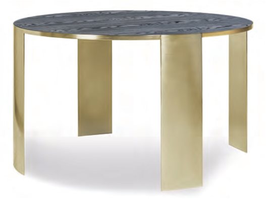 The Melrose range includes a set of two round coffee tables and a round dining table. The dining table features four legs and a base structure in metal. The curved legs are built directly into the metal profile of the top. The top is in wood and has a reduced thickness of only 2,2 cm, to highlight the concept of lightness.