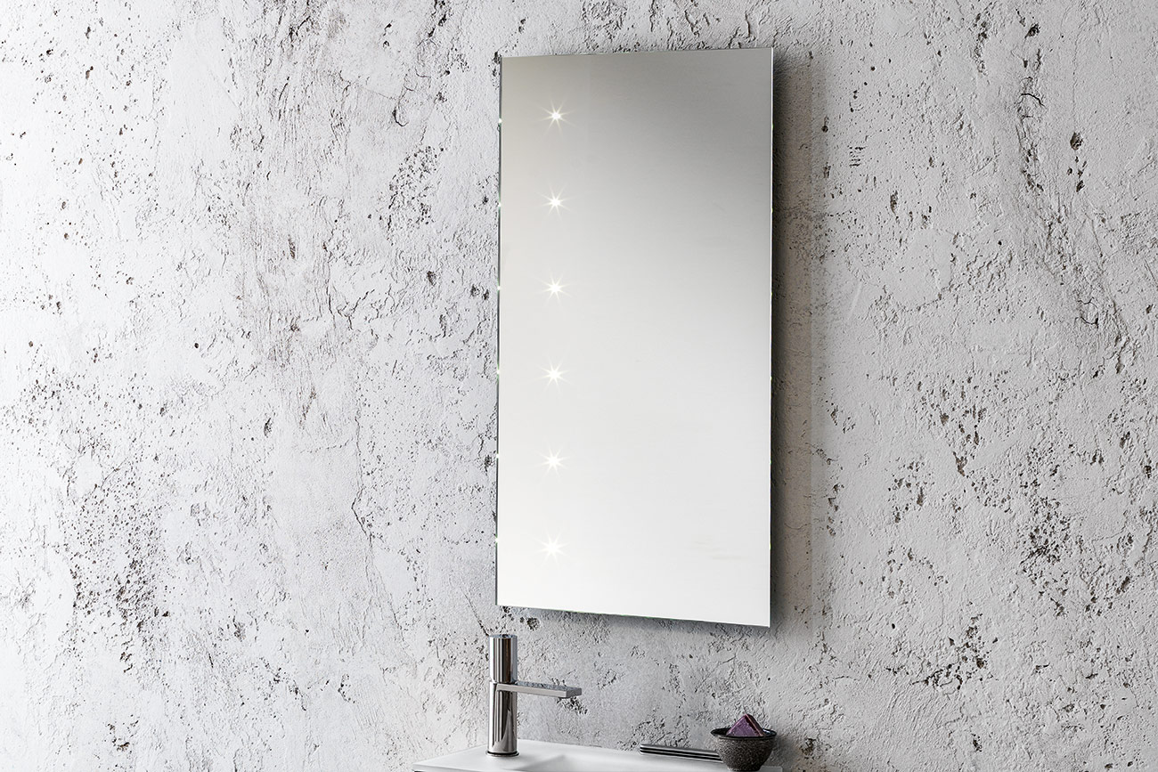 Specchi 5 mm bordo filo lucido con e senza illuminazione a led, trasformatore 220/12V e interruttore sensor completi di attacco a muro. Illuminazione disponibile SOLO LUCE FREDDA 5500°K.