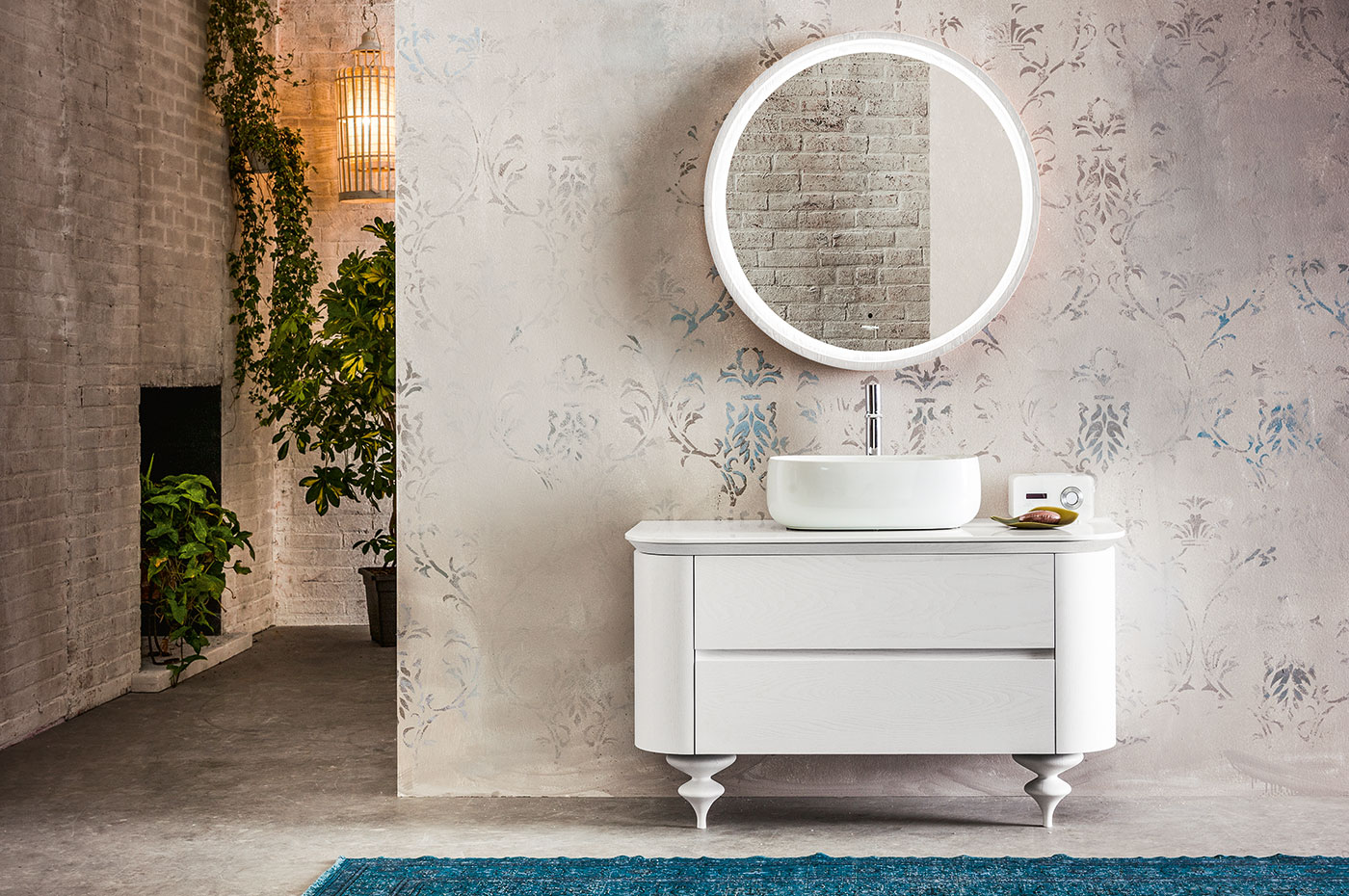Portalavabo con struttura in nobilitato melaminico idro RAL7010 rivestita in FRASSINO laccato finitura Cotone, Canapa, China o NOCE CANALETTO NATURALE. Frontali cassetto/cestone in cristallo smaltato o decorato (Bianco assoluto 30/ specchio). Apertura/ chiusura manuale.