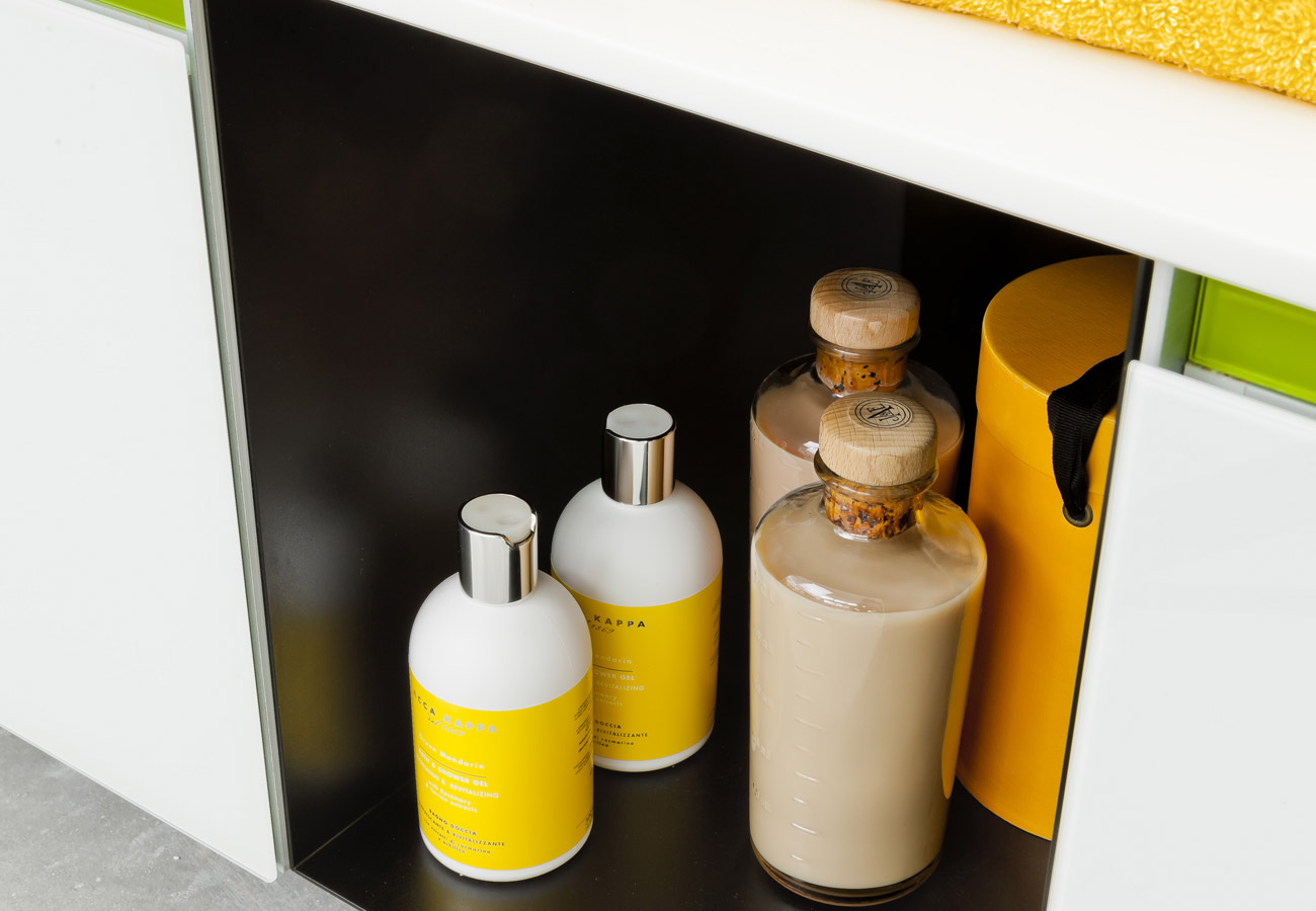 Per questa collezione è stato pensato un lavabo integrato dalla fusione particolare che permette di sfruttare al meglio tutta la profondità del mobile e di poter usufruire di miscelatori sia da appoggio che a muro.