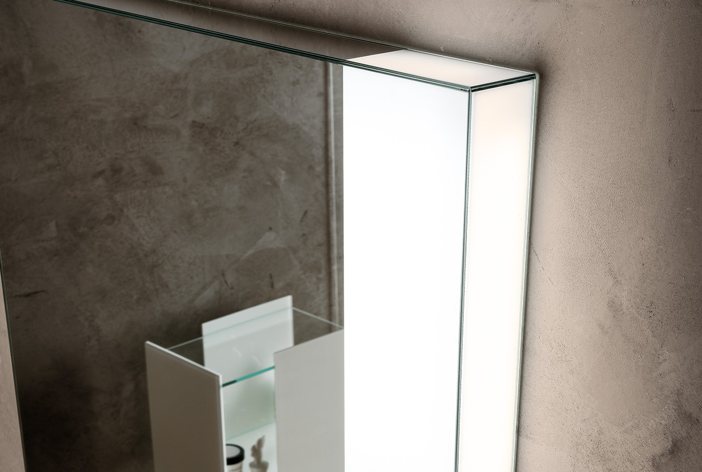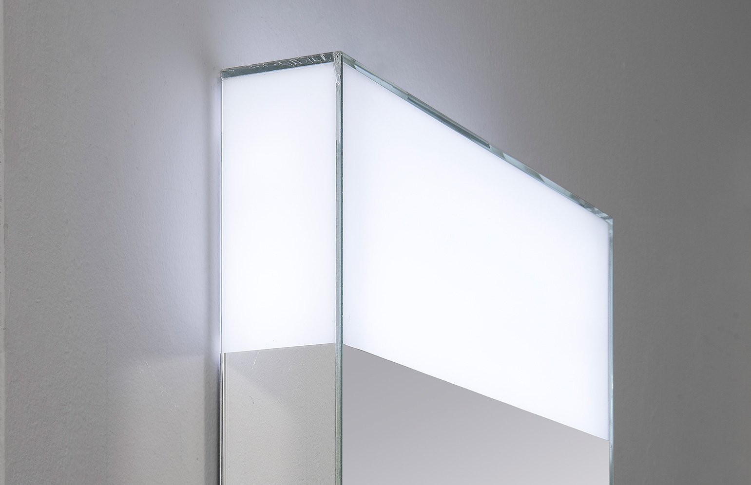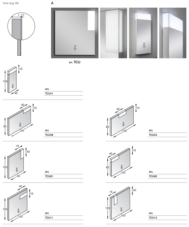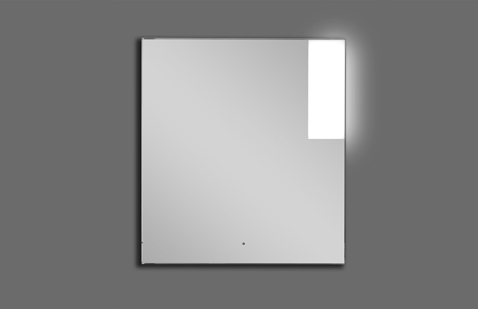 Specchio 5 mm incollato a 45° dotato di finestra retroilluminata da lampada a led. Specchio completo di trasformatore 220/12V, interruttore sensor e telaio. Di serie luce fredda 5500°K, su richiesta luce calda 3300°K.