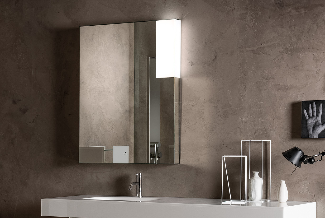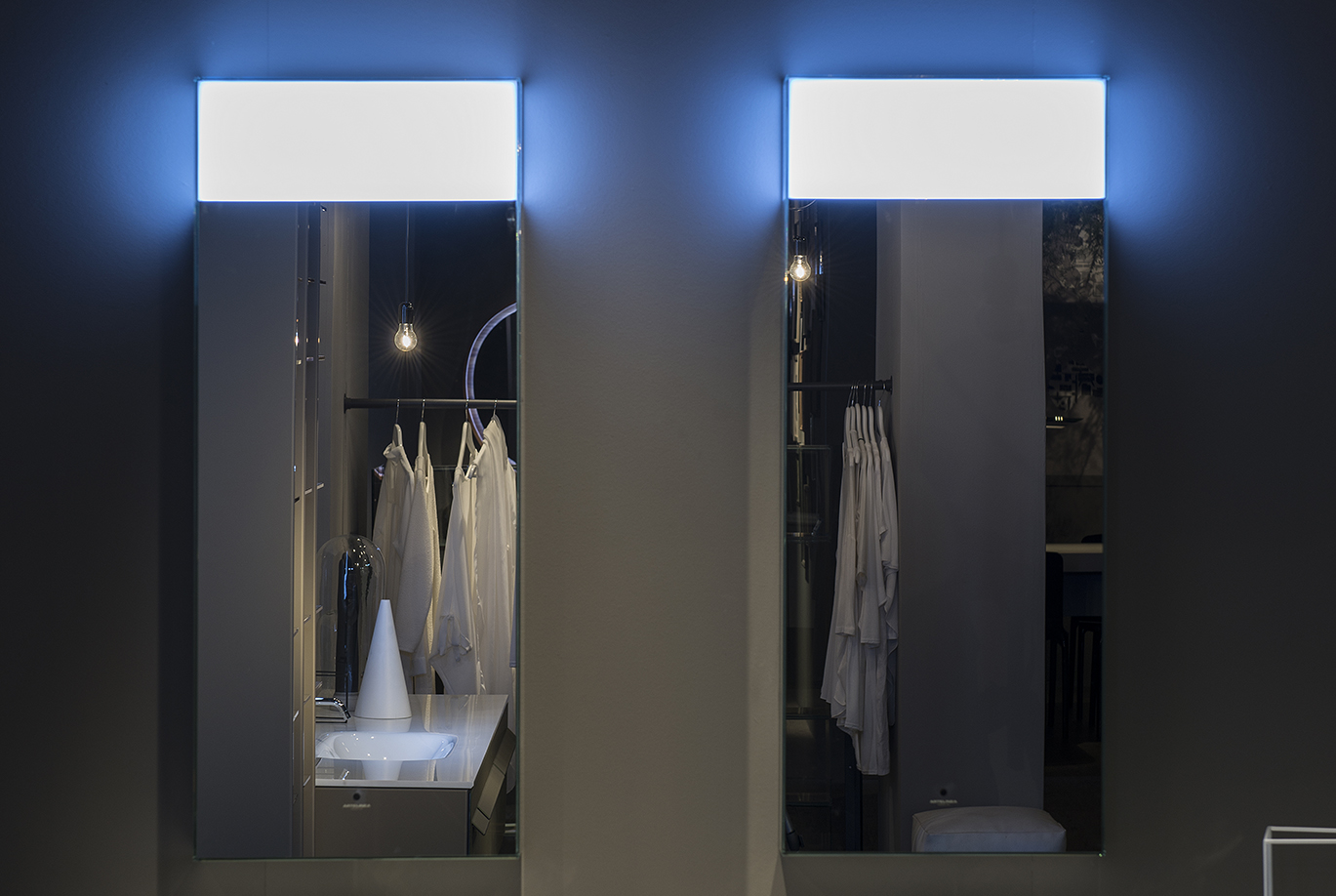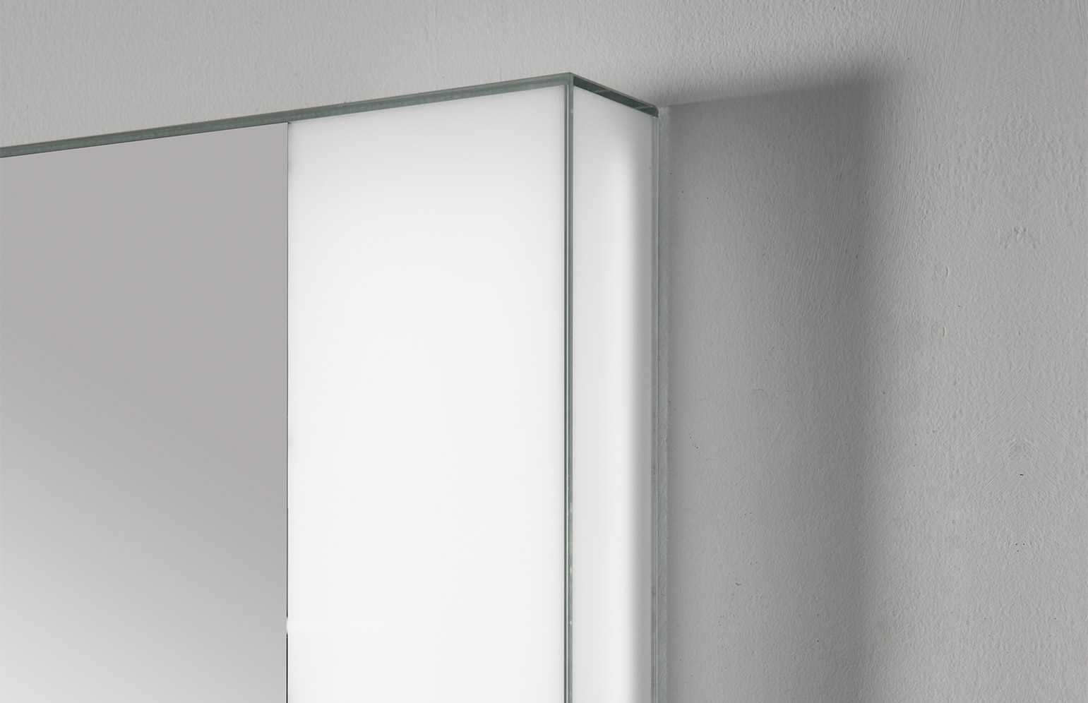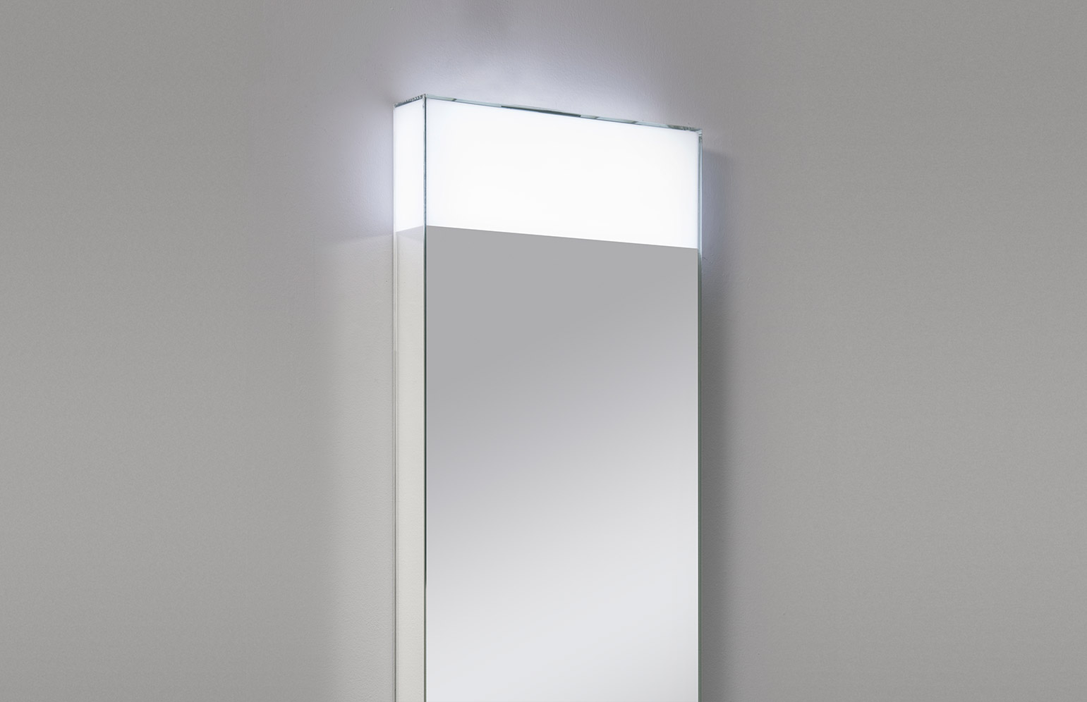 Specchio 5 mm incollato a 45° dotato di finestra retroilluminata da lampada a led. Specchio completo di trasformatore 220/12V, interruttore sensor e telaio. Di serie luce fredda 5500°K, su richiesta luce calda 3300°K.