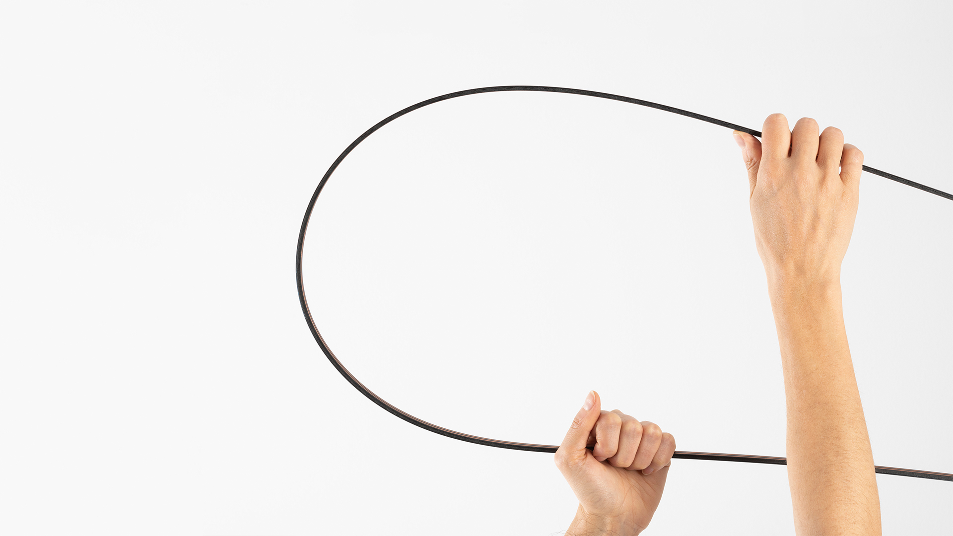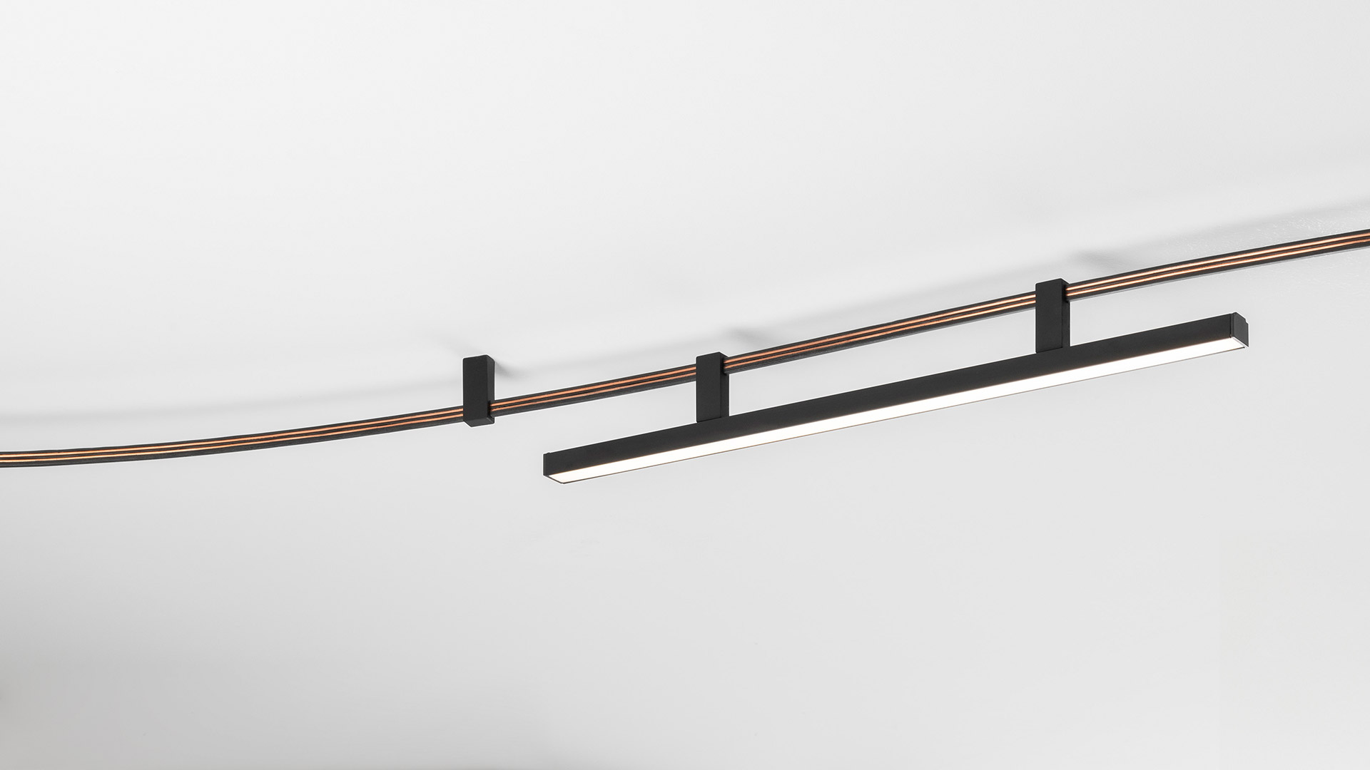 The two copper conductors, co-extruded with a section of thermoplastic insulating material, are left exposed to view yet fully safe. A slim band of harmonic steel runs along the back, forming the profile and allowing the different geometric shapes to be plied and retained.