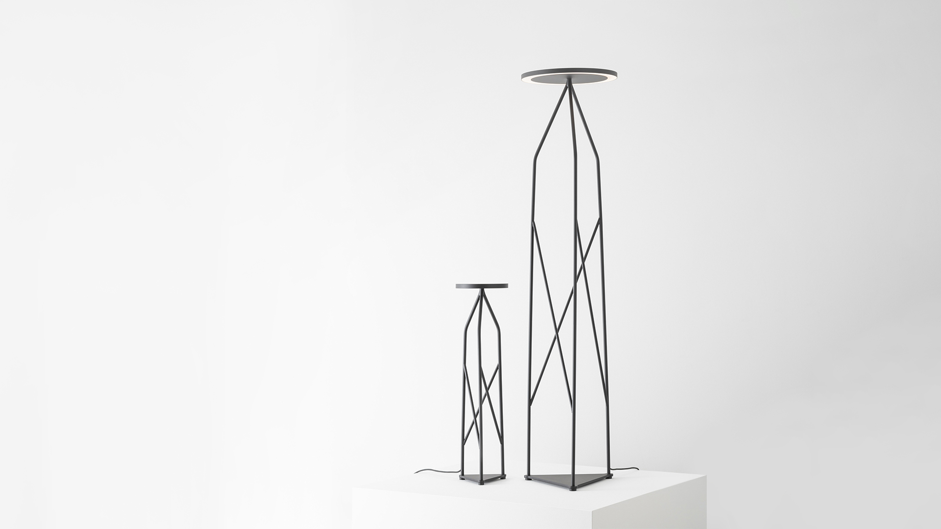 Trilix is a family of lamps for indoor and outdoor spaces featuring a lightweight structure, comprised of three elements that are intertwined to give stability and support to a flat disc with a ring of direct light which is softly diffused in the surrounding space.