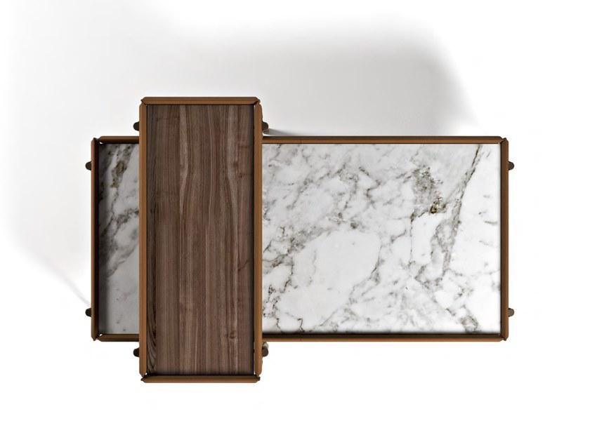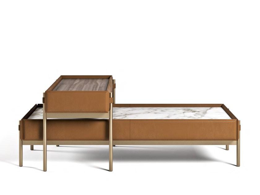 Coffee table low, cm 124,5x60x28h Top in E ramosa marble cross cut, frame in Cuoio col. Dark Mocha, flaps in Cuoio col. Dark Mocha, metal structure in light gold