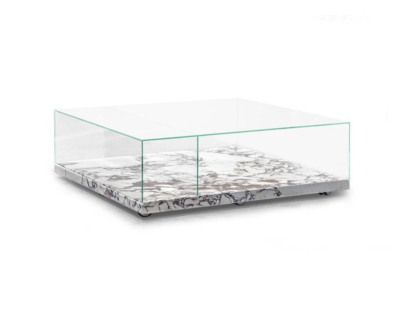 Coffee table, cm 120x120x37h Crystal box in transparent glass, base in breccia medicea marble