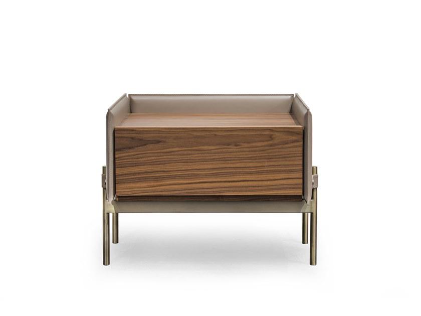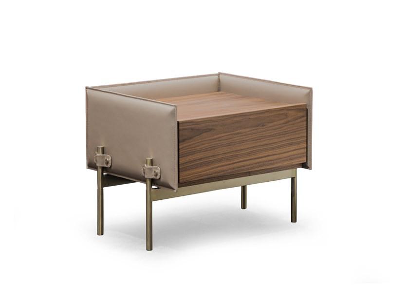 Night table, cm 65x50x49h Structure in cuoio leather col Tortora, tone on tone stitching, top and front drawers in Canaletto Walnut veneer open pore finish, metal feet light gold finish with cuoio leather details.