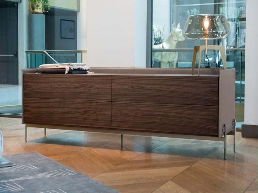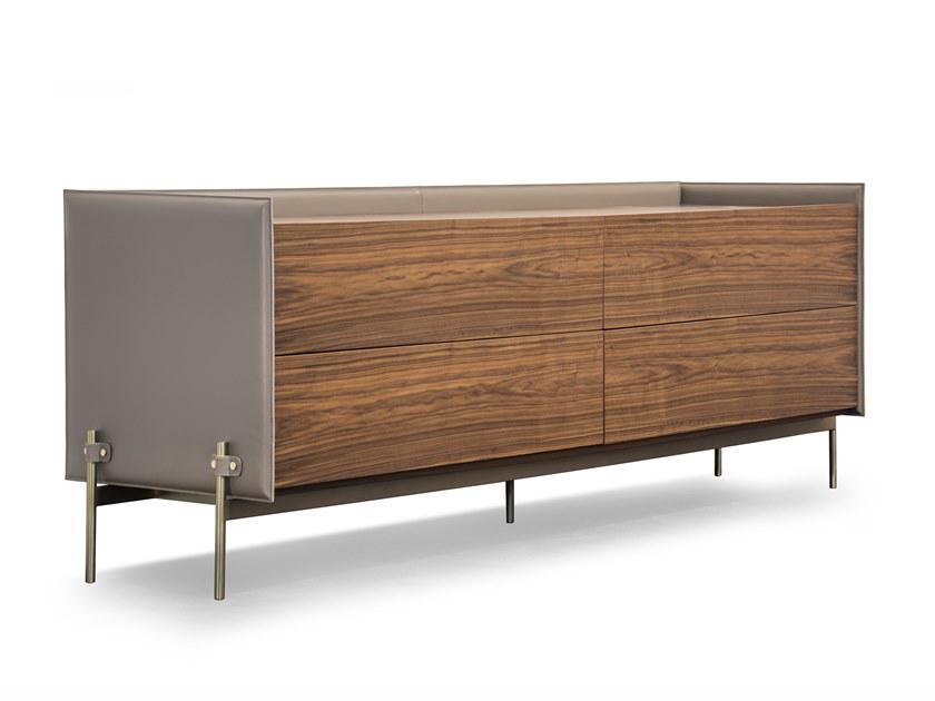 TV Cabinet, cm 230x60x60h Top and fronts in veneer Ash Stained Mink, structure in Cuoio col. Taupe, flaps in Cuoio col. Taupe, metal structure in light gold