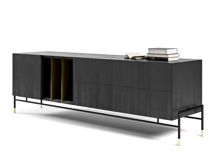 Sideboard, cm 230x55x72h Structure in veneer Ash laquered  col. black Open pore, magazine  rack in light gold, metal base matt  black, feet in light gold finish x55x72h Structure in veneer Ash laquered col. black Open  pore, magazine rack in light gold, metal base matt  black, feet in light gold finish