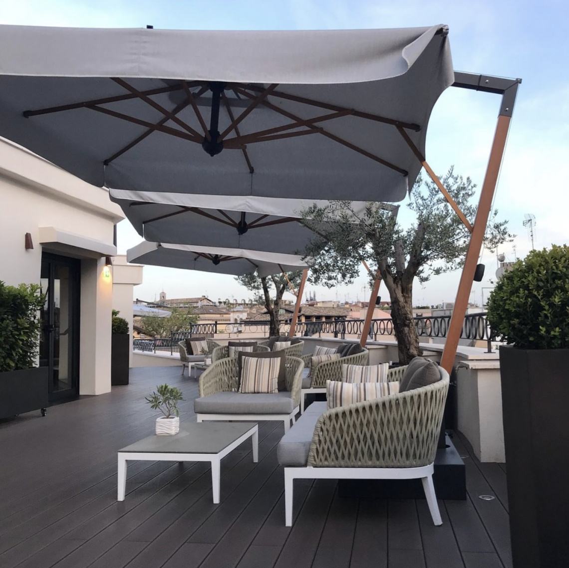 Soffietto antivento, apertura a manovella. Girevole a 360°. Base in acciaio inclusa.