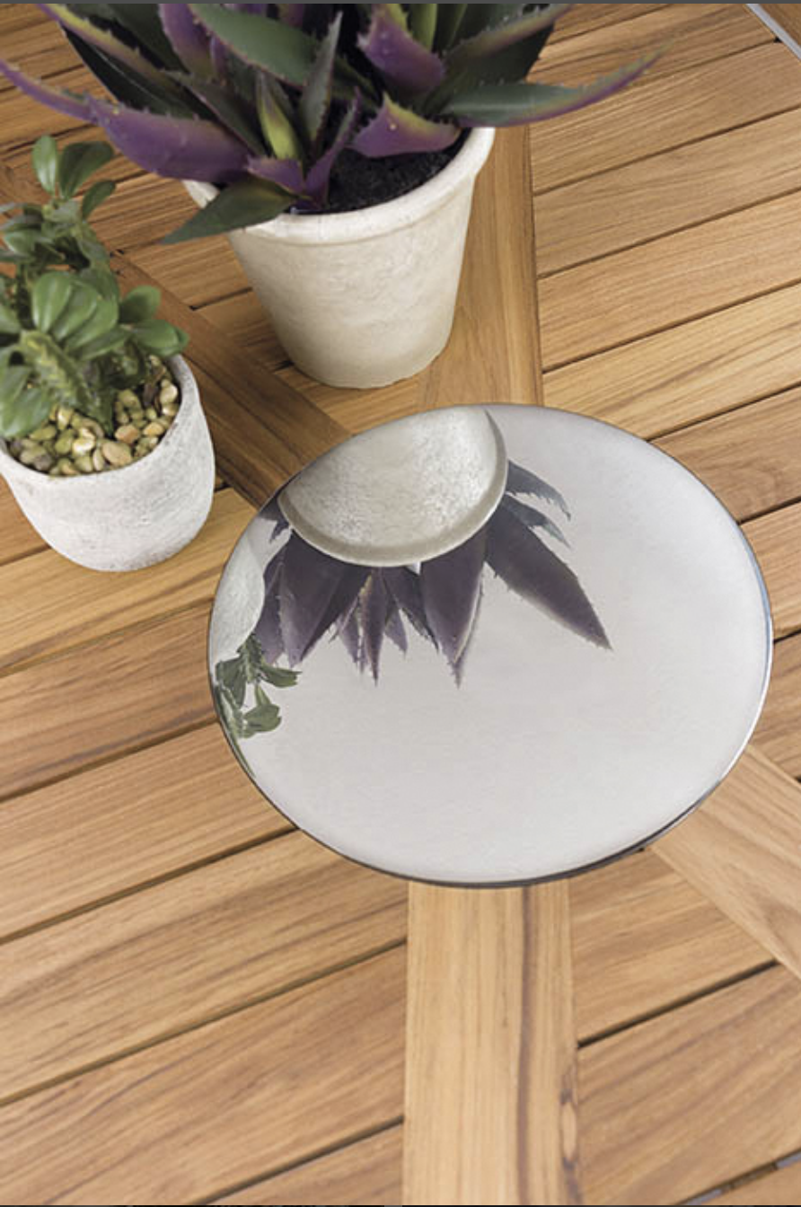 Strutture in TEAK massiccio Asiatico; dettagli in acciaio satinato. Disco in acciaio diametro 32 cm.