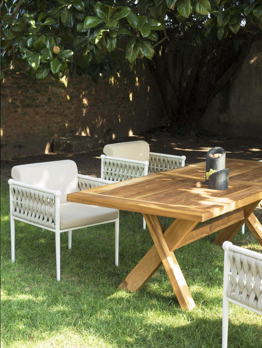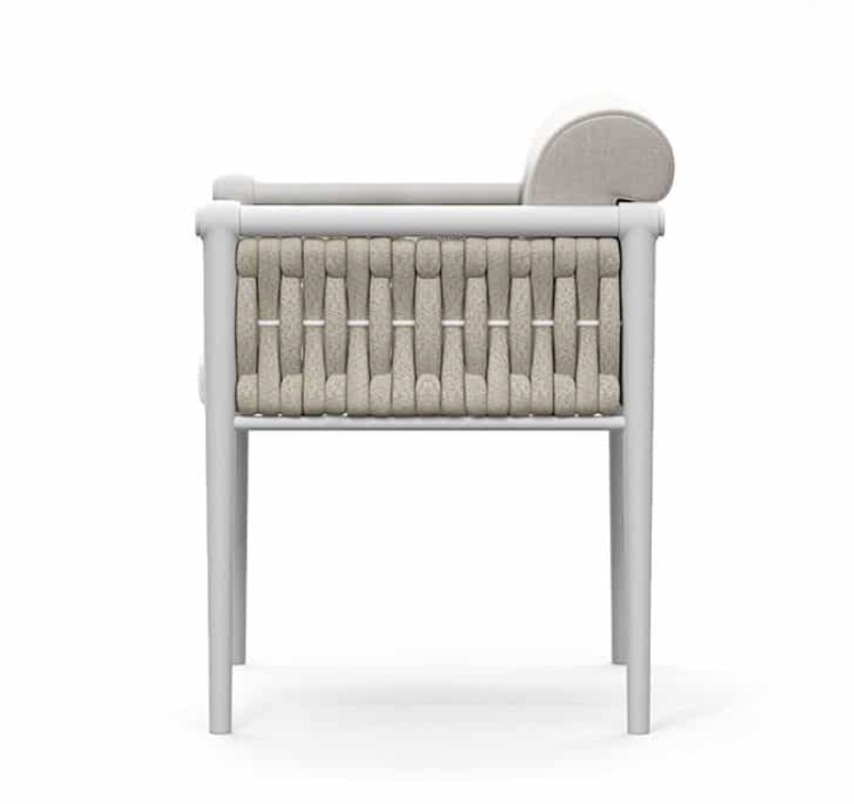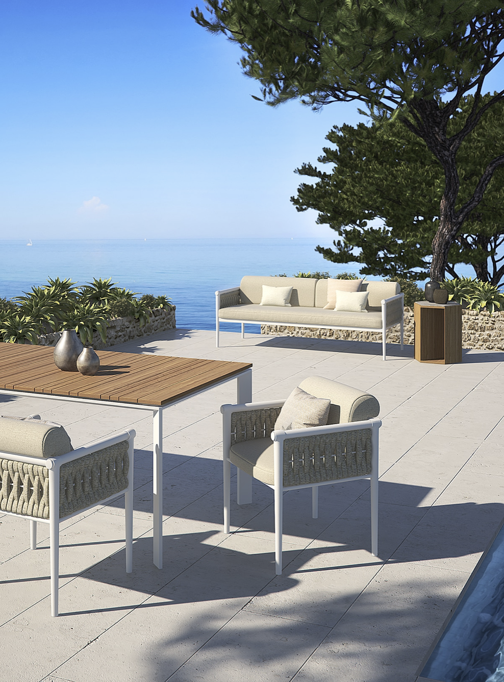 Come in una cravatta il nodo diventa dettaglio di eleganza ed elemento di distinzione, Dandy interpreta il concept attraverso una struttura in alluminio intrecciata da morbide corde.