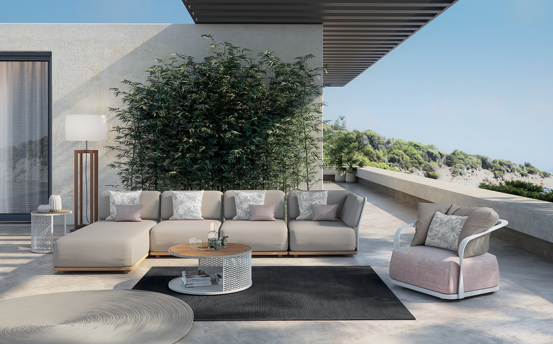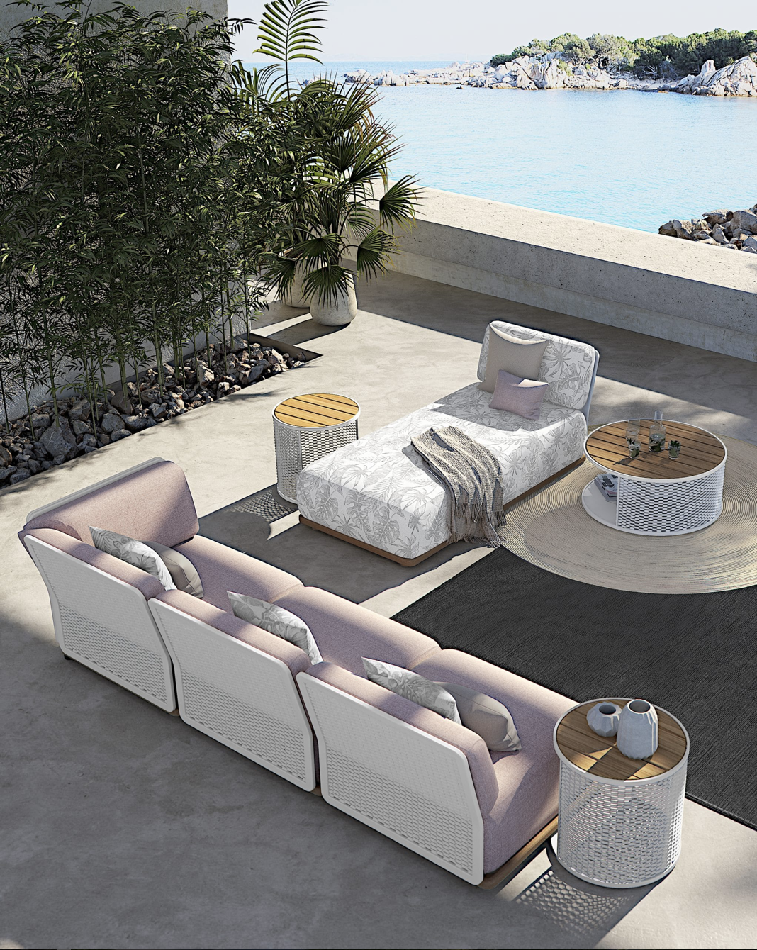 L’ispirazione cresce osservando le cose più semplici. Una lamiera stirata in alluminio bianco evolve in una texture bianca sulla quale inventare molteplici moduli e creare la composizione che più corrisponde alla natura dello spazio. Un divano modulare, servitori legati all’ambiente lounge e punti luce fanno da protagonisti alla collezione di
