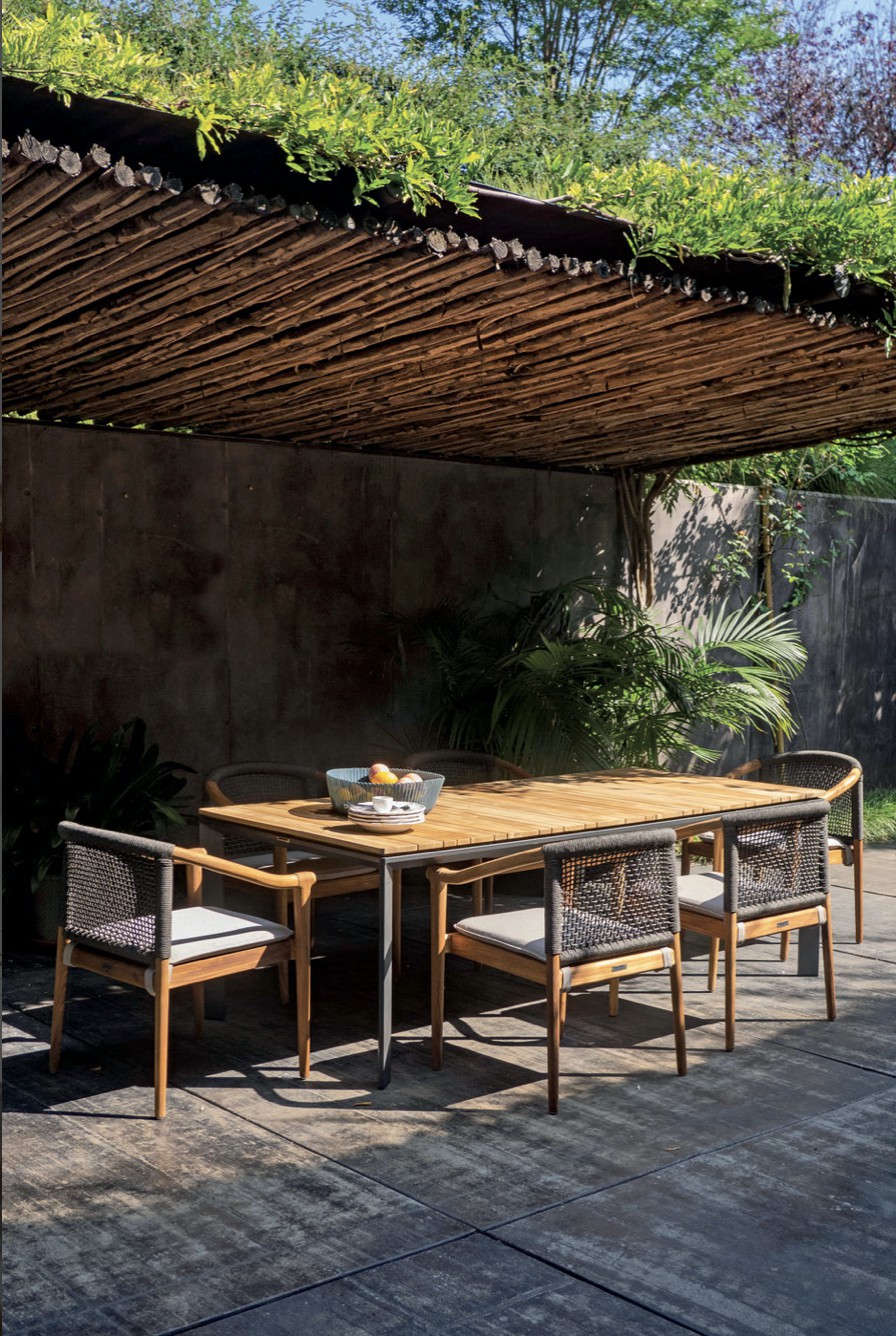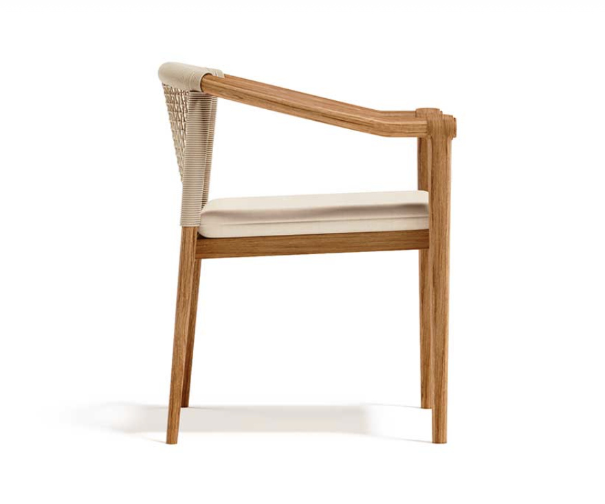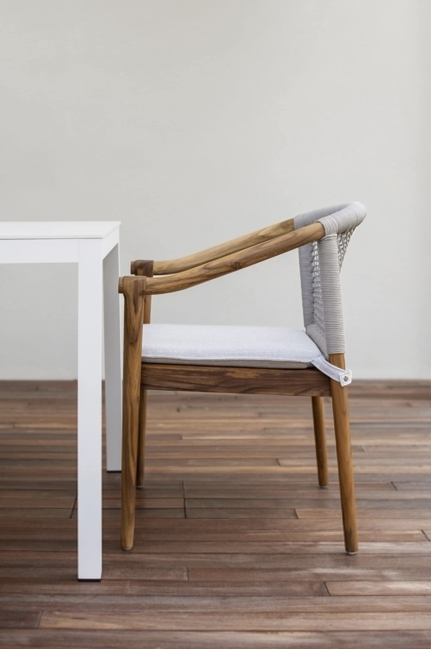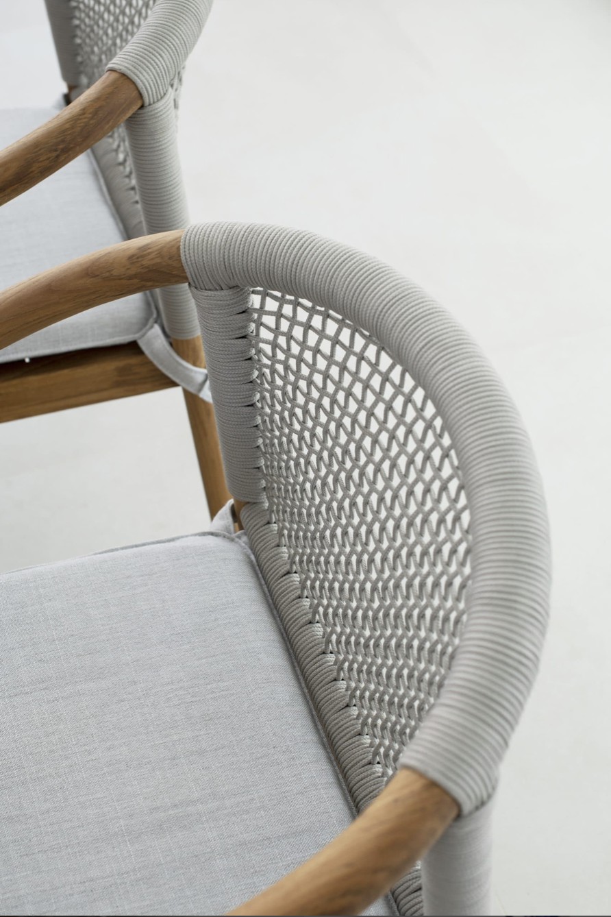 Design pulito e minimale descritto in una struttura completamente in teak intrecciata da una corda rotonda che crea una maglia morbida e di forte tenuta. Un nido accogliente diventa spazio di conversazione e lettura.