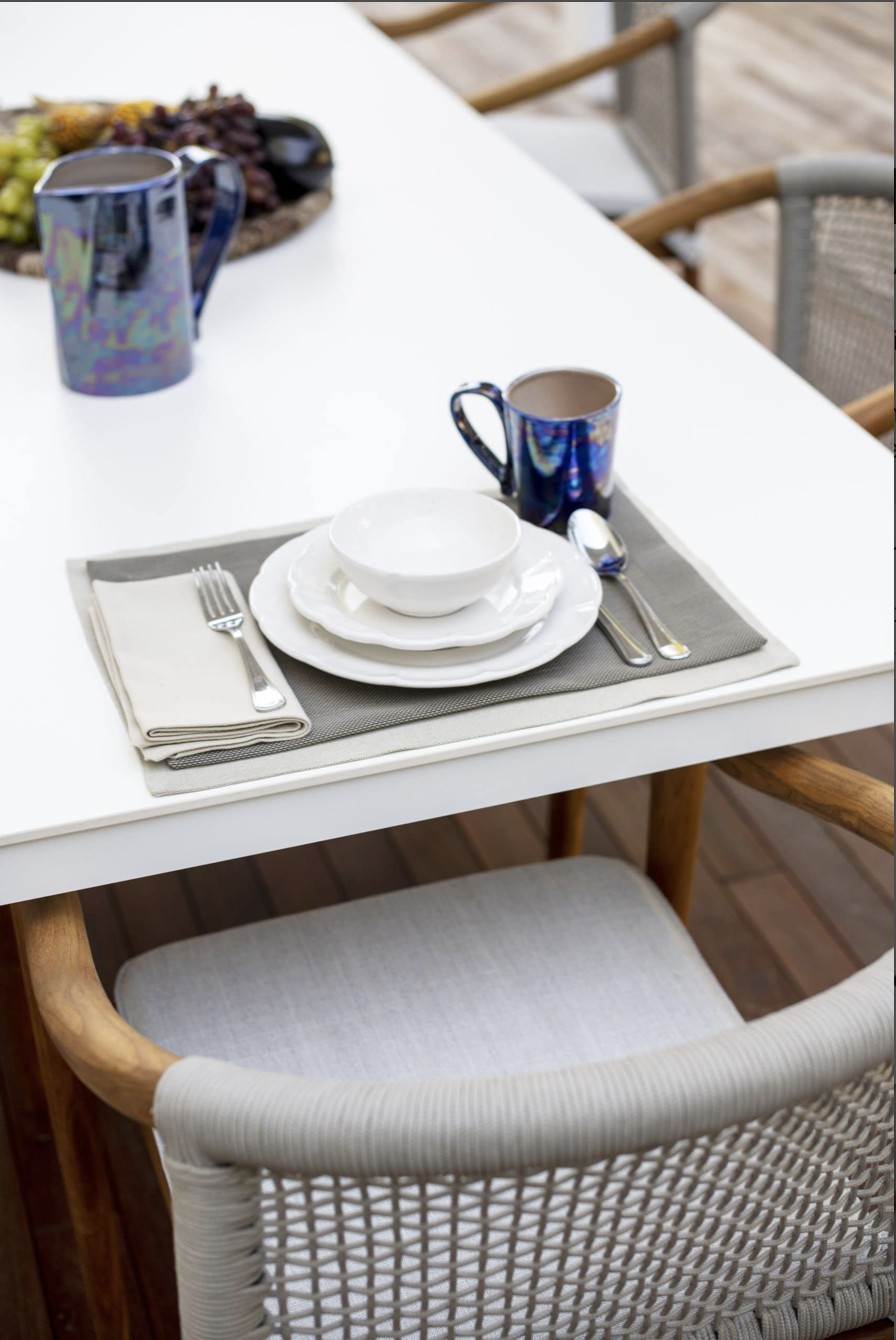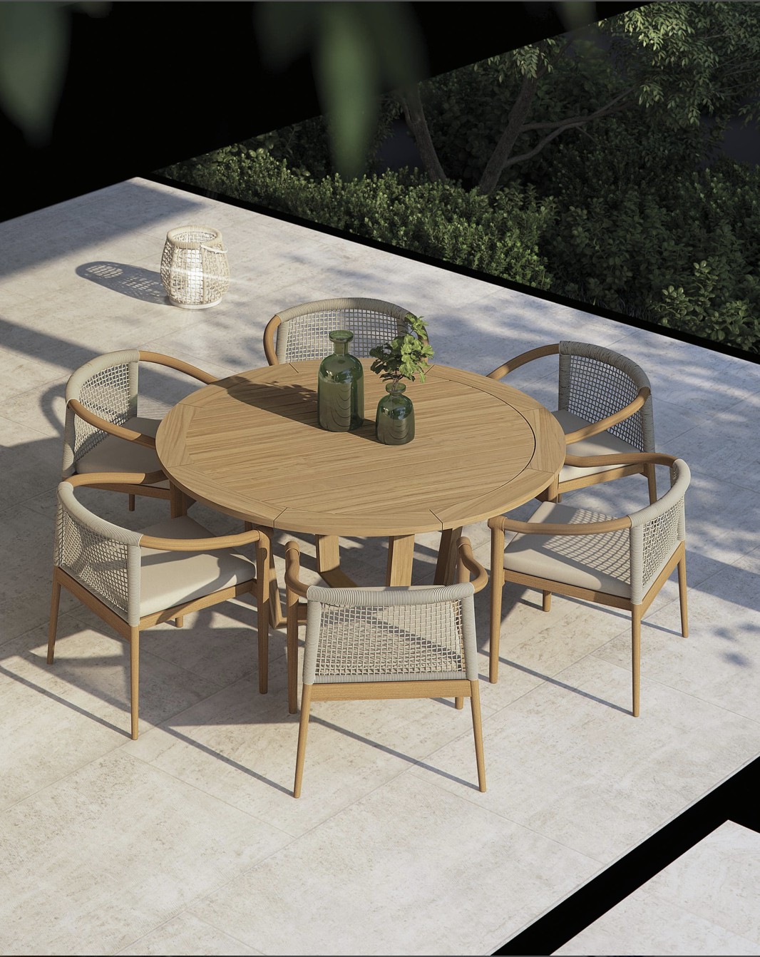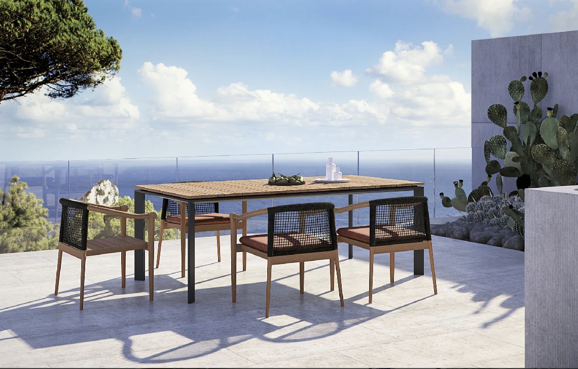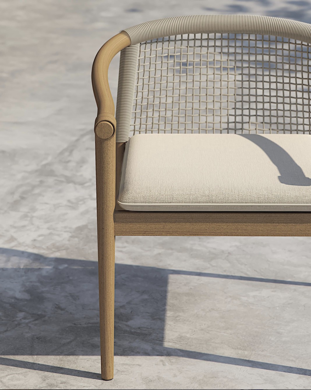 Design pulito e minimale descritto in una struttura completamente in teak intrecciata da una corda rotonda che crea una maglia morbida e di forte tenuta. Un nido accogliente diventa spazio di conversazione e lettura.