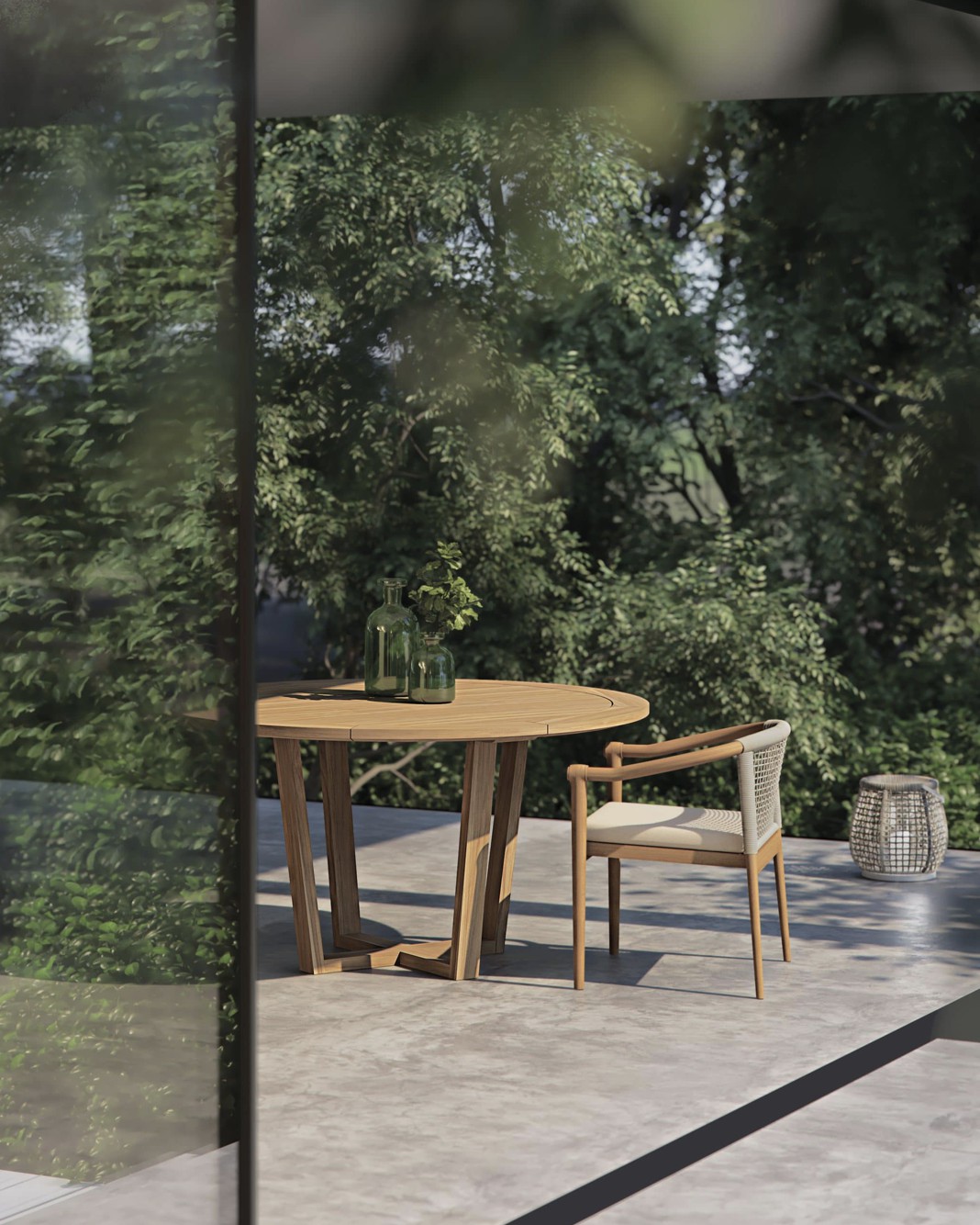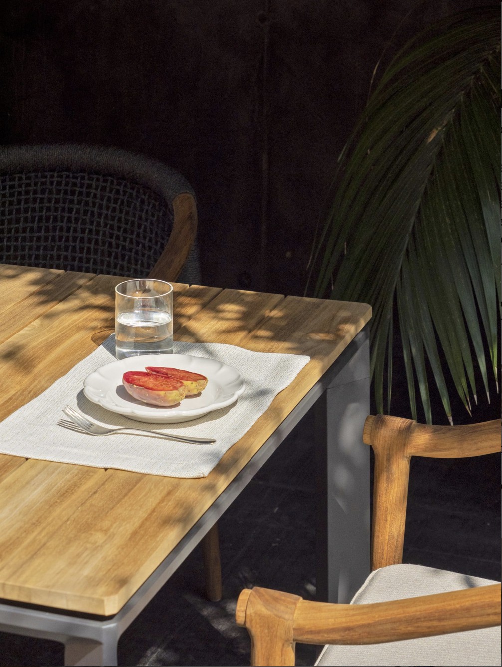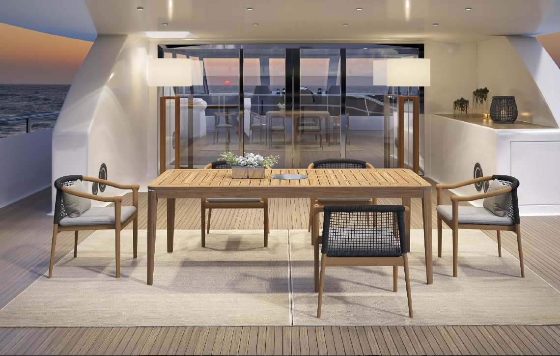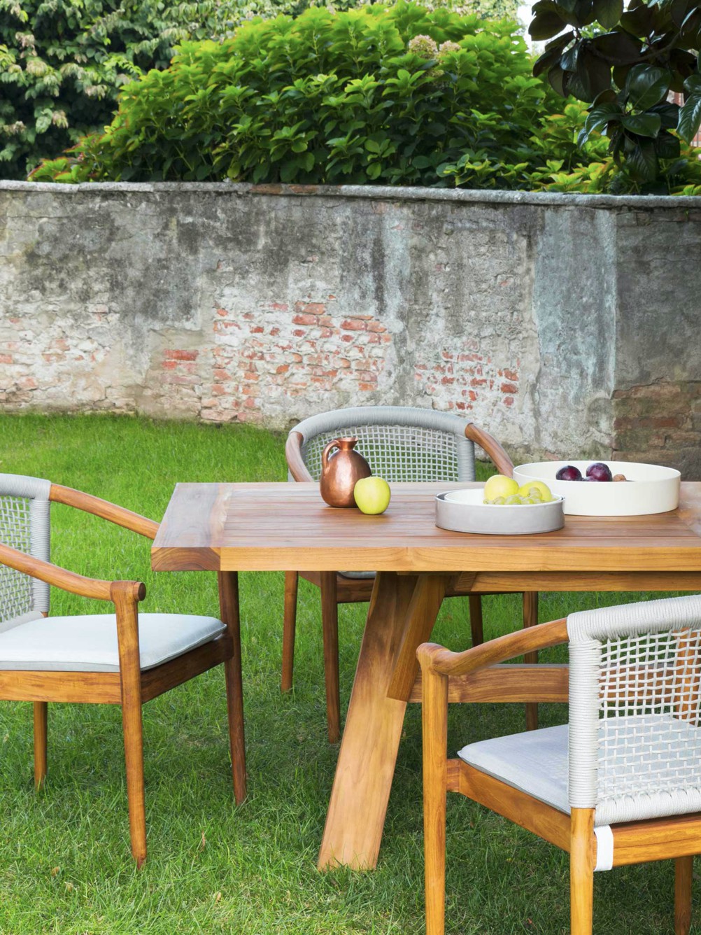 Design pulito e minimale descritto in una struttura completamente in teak intrecciata da una corda rotonda che crea una maglia morbida e di forte tenuta. Un nido accogliente diventa spazio di conversazione e lettura.