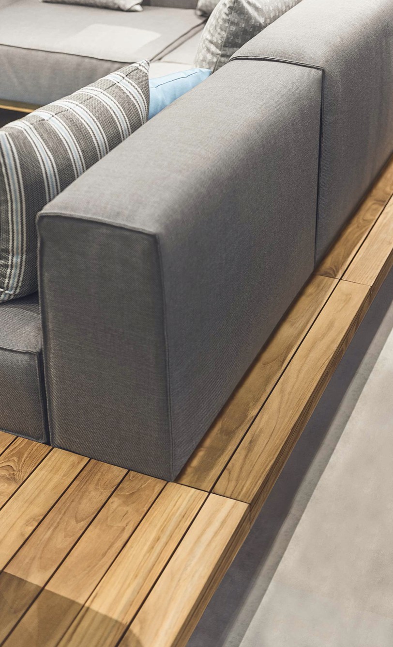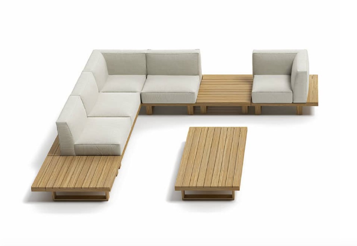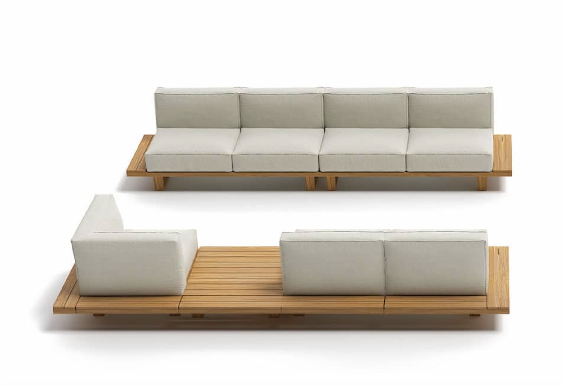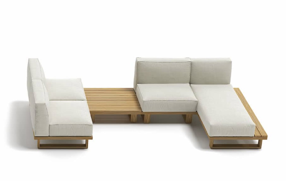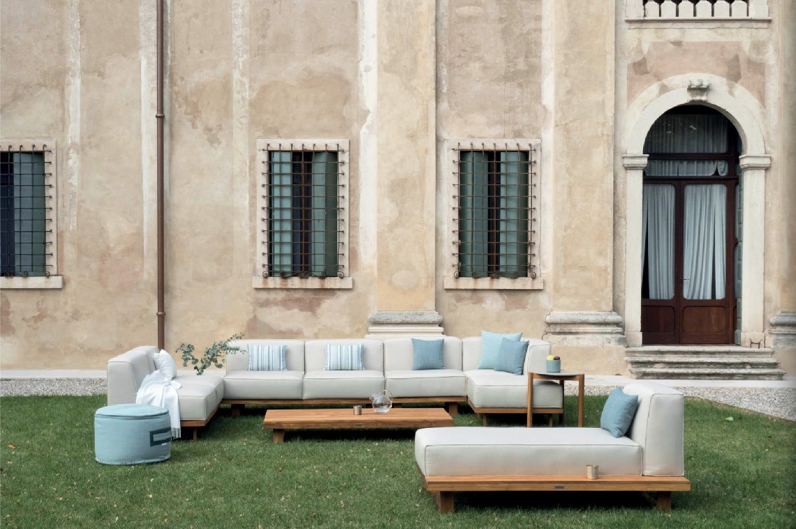 9.zero rappresenta un sistema di sedute modulari. La semplicità costruttiva dei 9 moduli base consente la realizzazione di un vasto numero di soluzioni compositive per soddisfare molteplici esigenze di spazio e funzionalità. Le strutture sono realizzate da nove doghe ciascuna di nove centimetri in legno di teak indonesiano levigato e oliato. Le imbottiture sono realizzate con gomme drenanti il tutto rivestito con i tessuti per esterni della collezione Atmosphera.