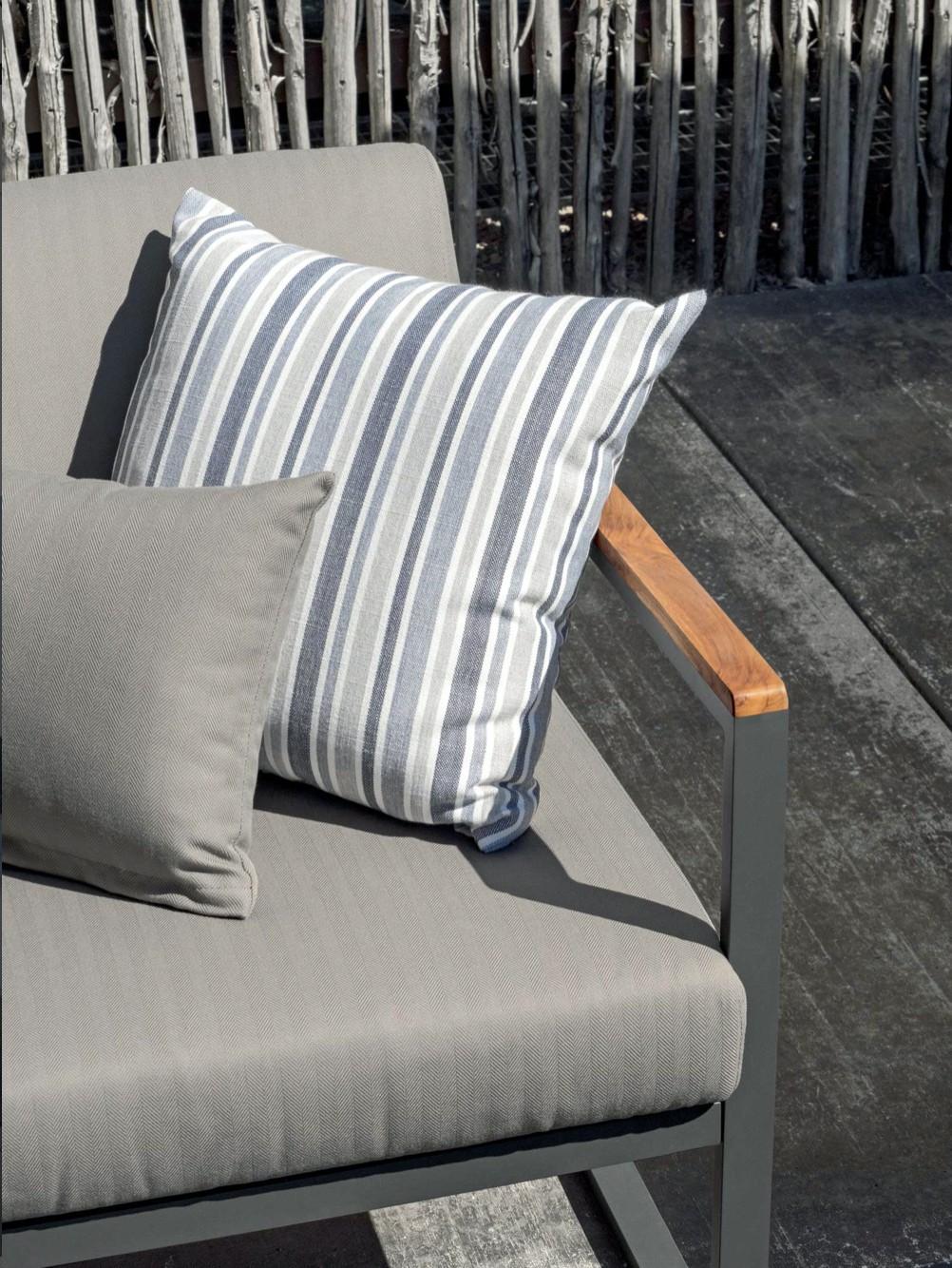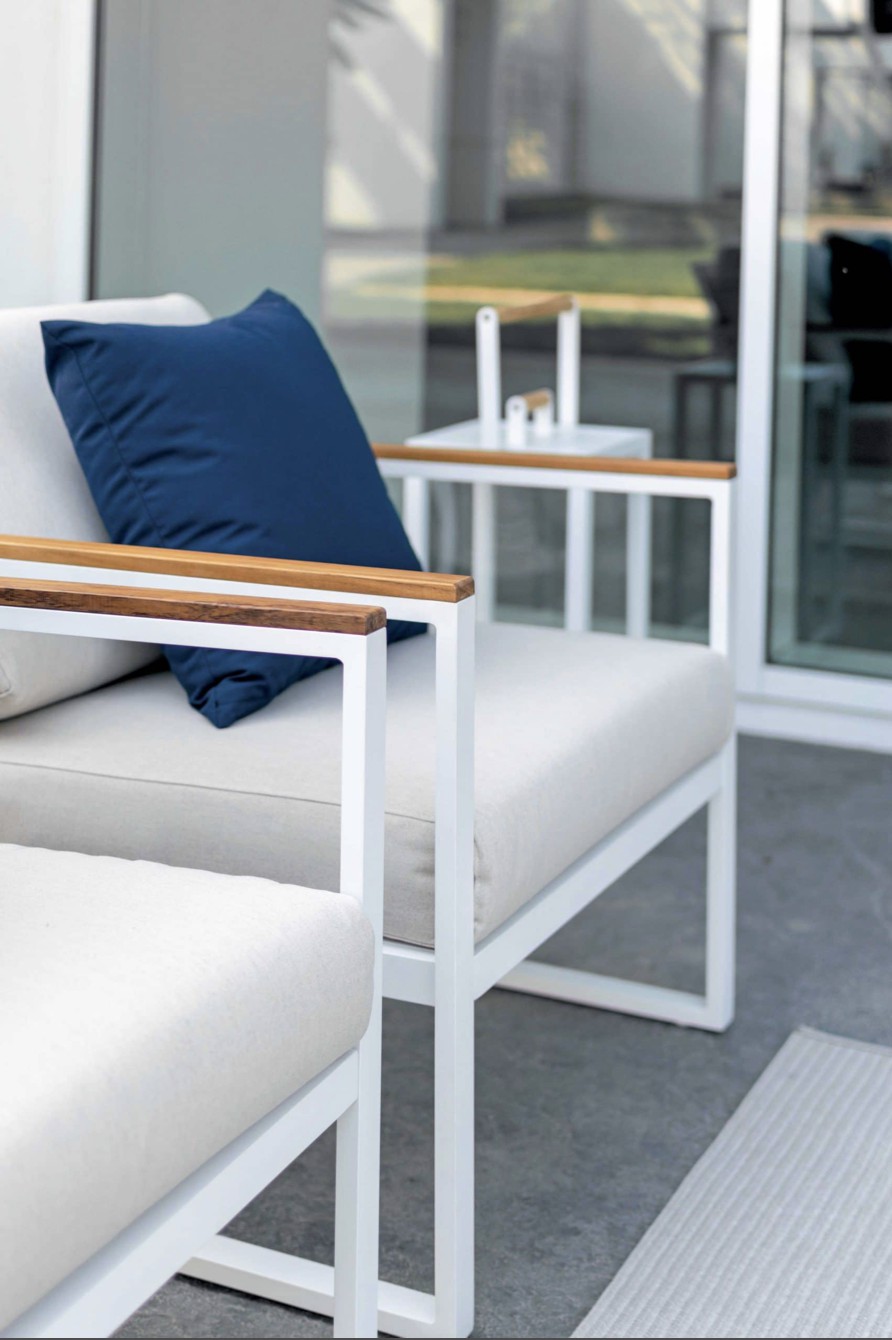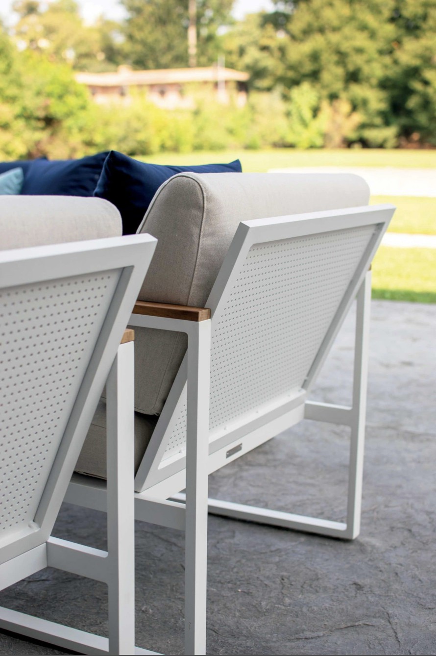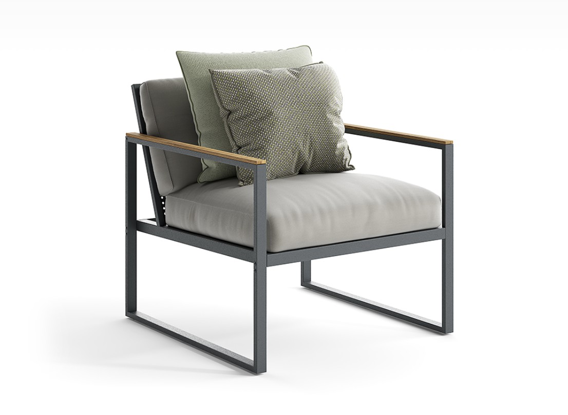 Le facce del cubo evolvono in braccioli rivestiti da dettagli in teak e schienali caratterizzati da lamiere forate.