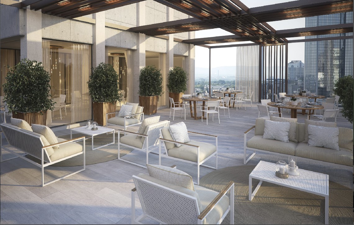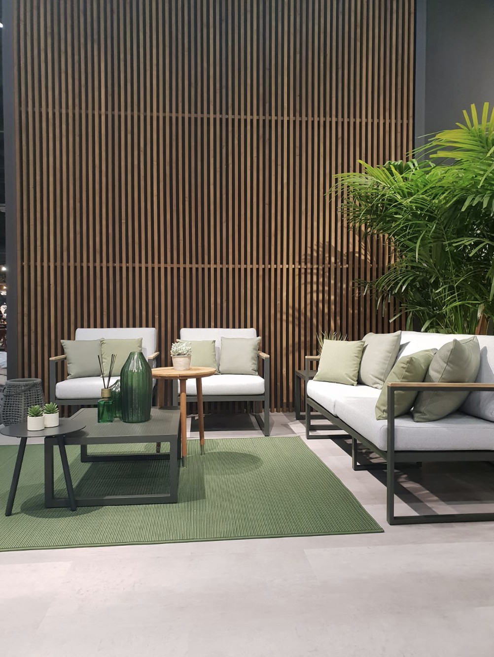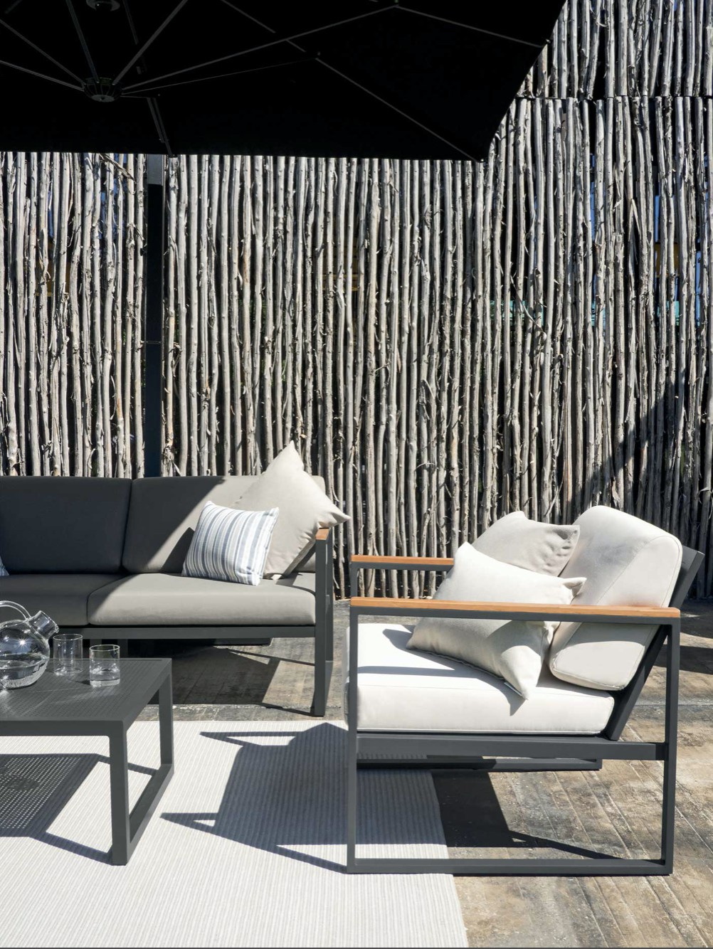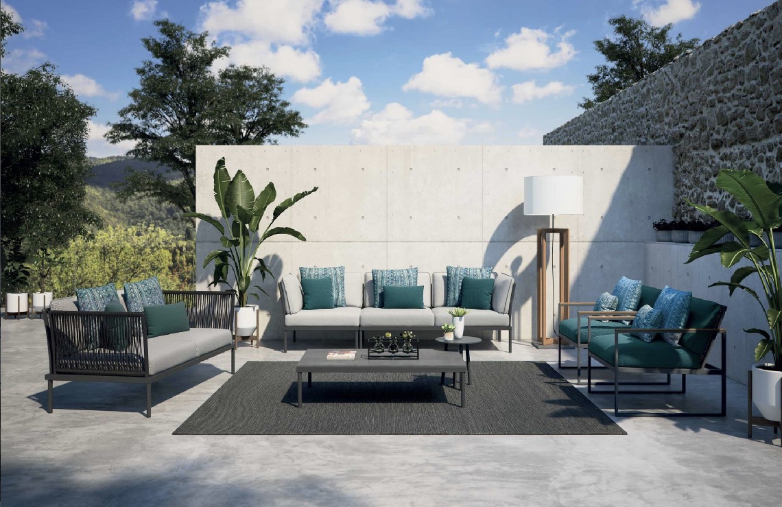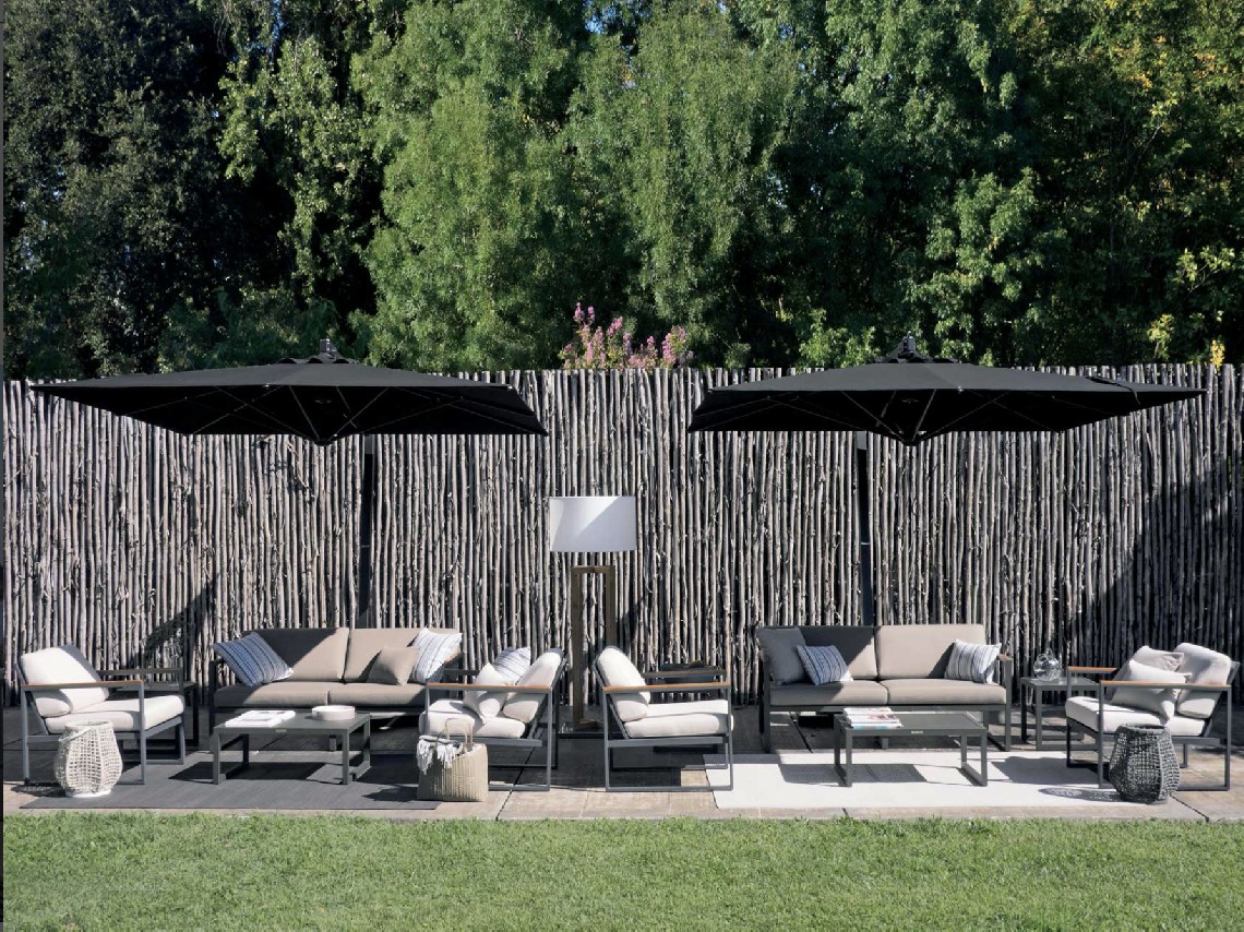 Le facce del cubo evolvono in braccioli rivestiti da dettagli in teak e schienali caratterizzati da lamiere forate.