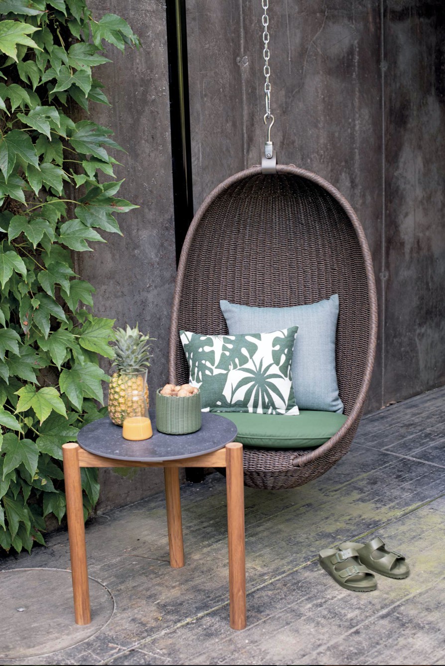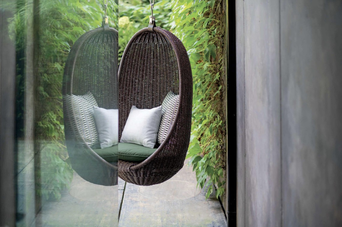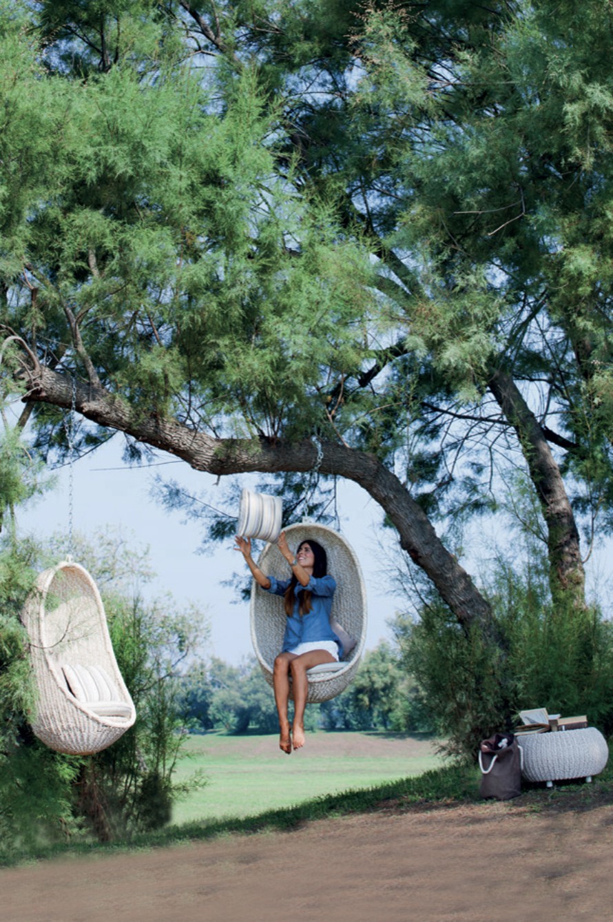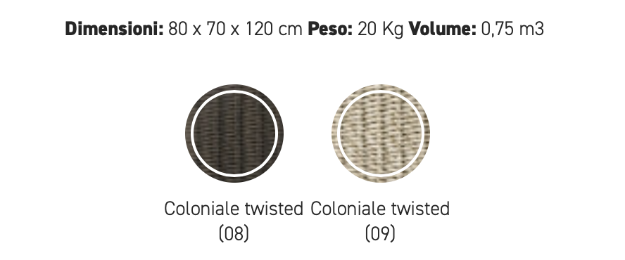 Strutture in alluminio verniciato epossidico per esterni. Intreccio in estruso di polietilene solidificato ad acqua, intrecciato a mano.