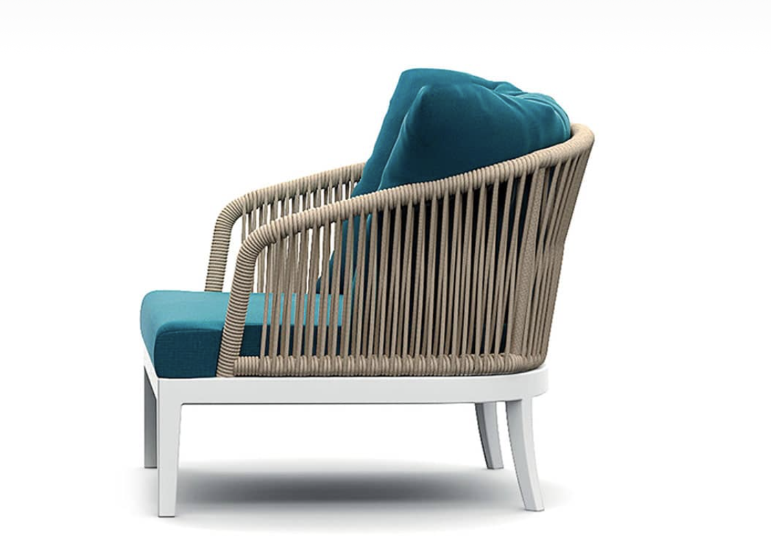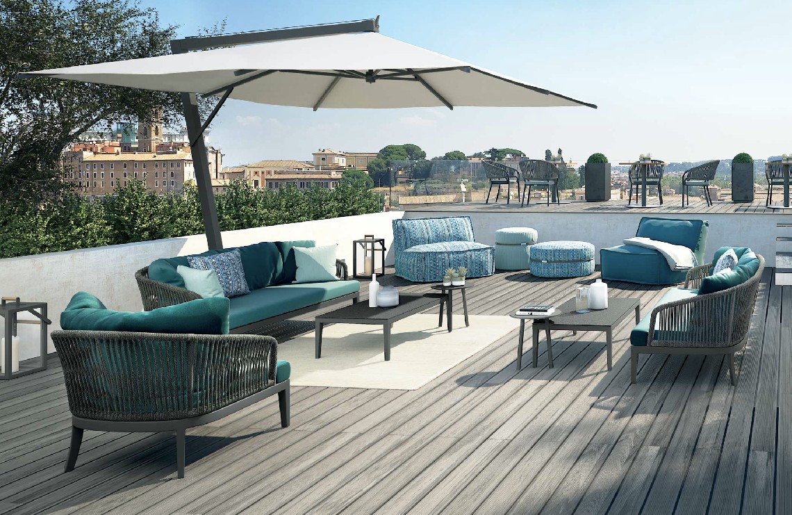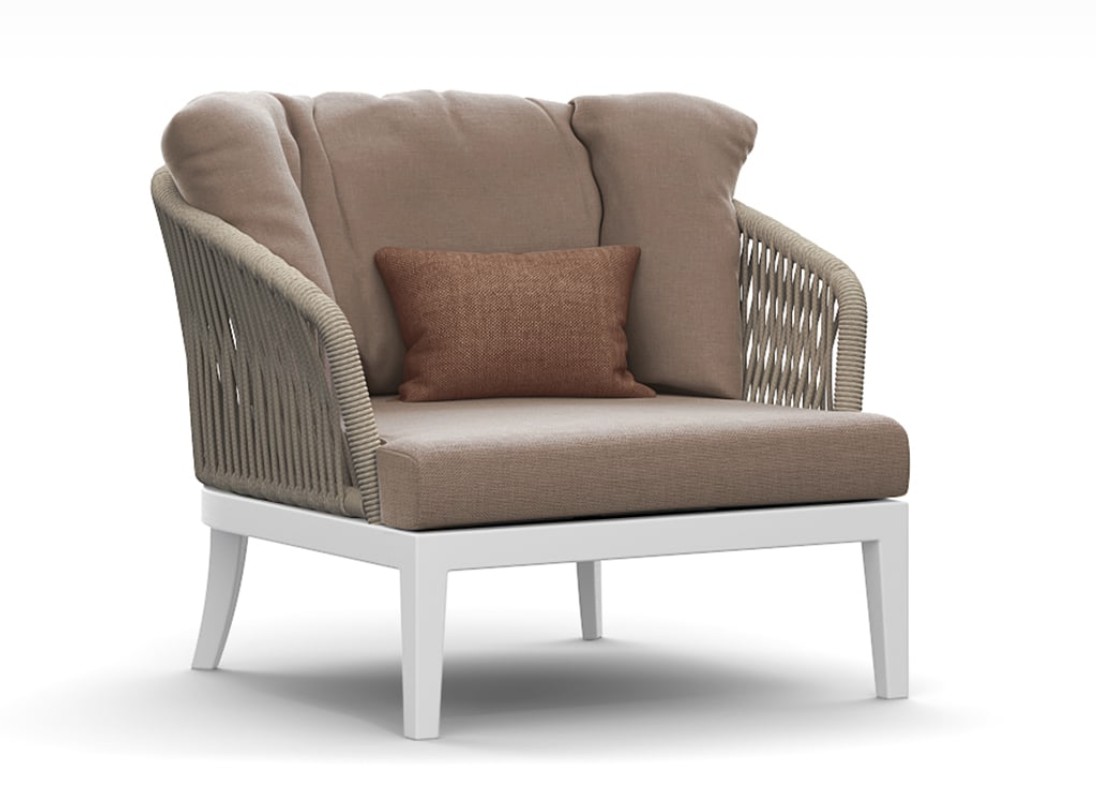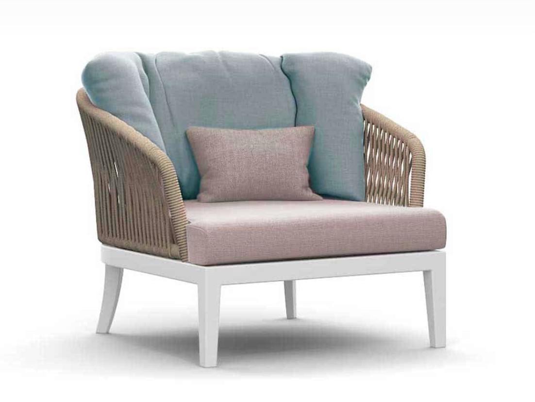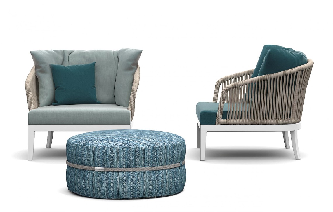 Un carattere signorile ed elegante cela un’anima minimale e giocosa. Fibre tessili sfumano in gradevoli nuances di verdi salvia e oliva che modellano forme morbide e ergonomicamente confortevoli. Una struttura in alluminio bianco o grafite risolve il problema degli spazi ibridi tra in e out coniugando molteplici soluzioni di arredo.