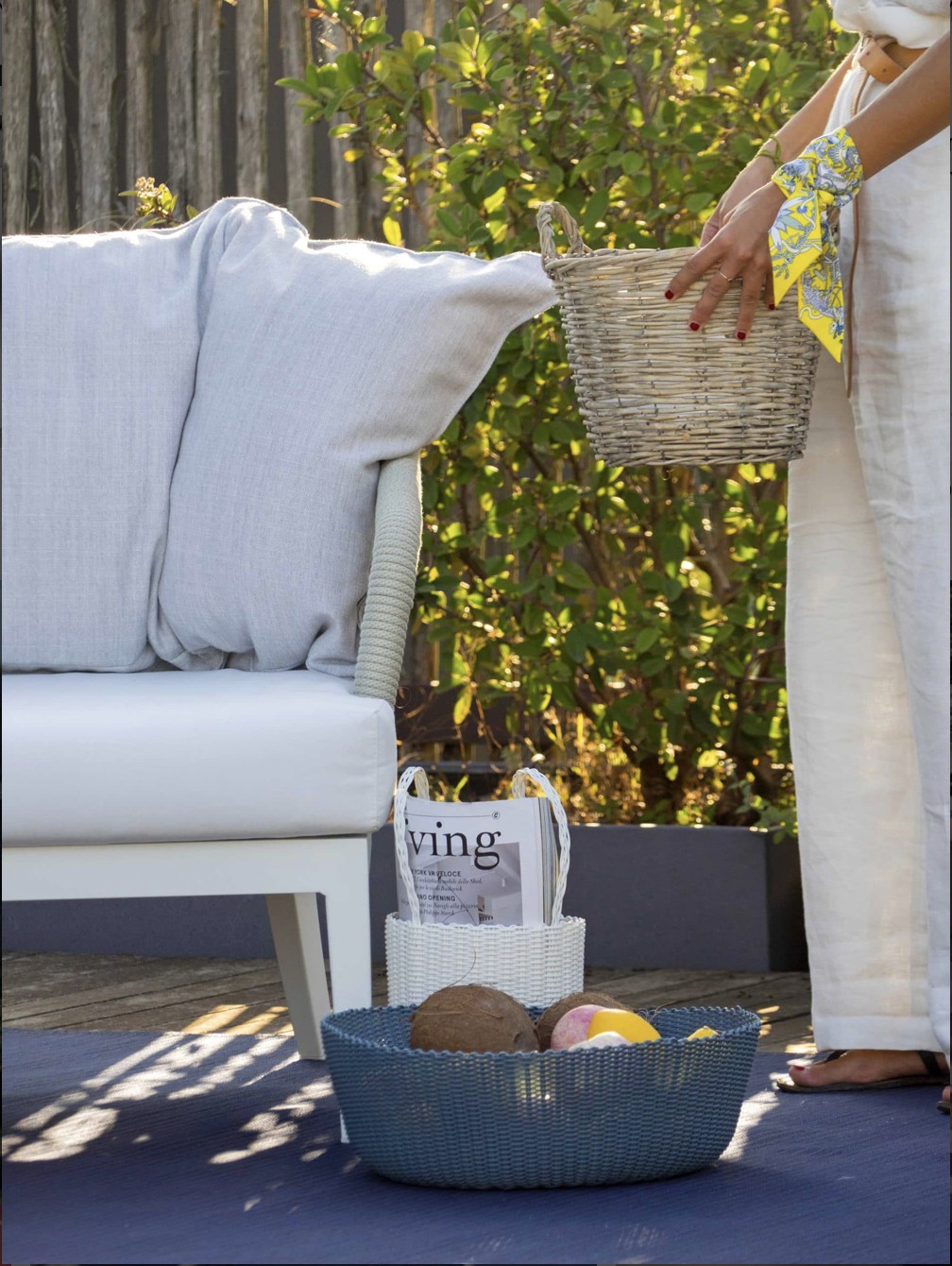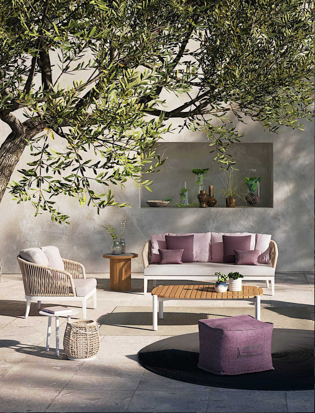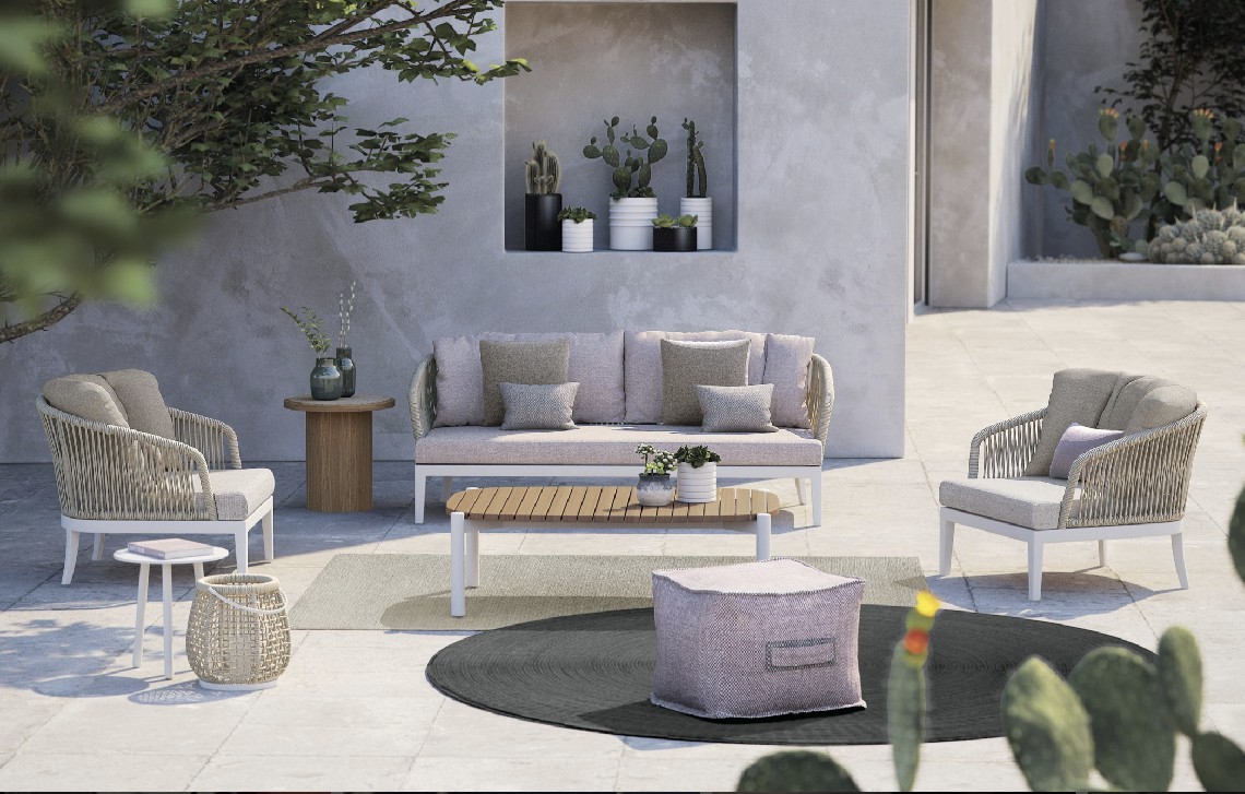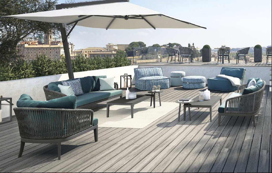 Un carattere signorile ed elegante cela un’anima minimale e giocosa. Fibre tessili sfumano in gradevoli nuances di verdi salvia e oliva che modellano forme morbide e ergonomicamente confortevoli. Una struttura in alluminio bianco o grafite risolve il problema degli spazi ibridi tra in e out coniugando molteplici soluzioni di arredo.