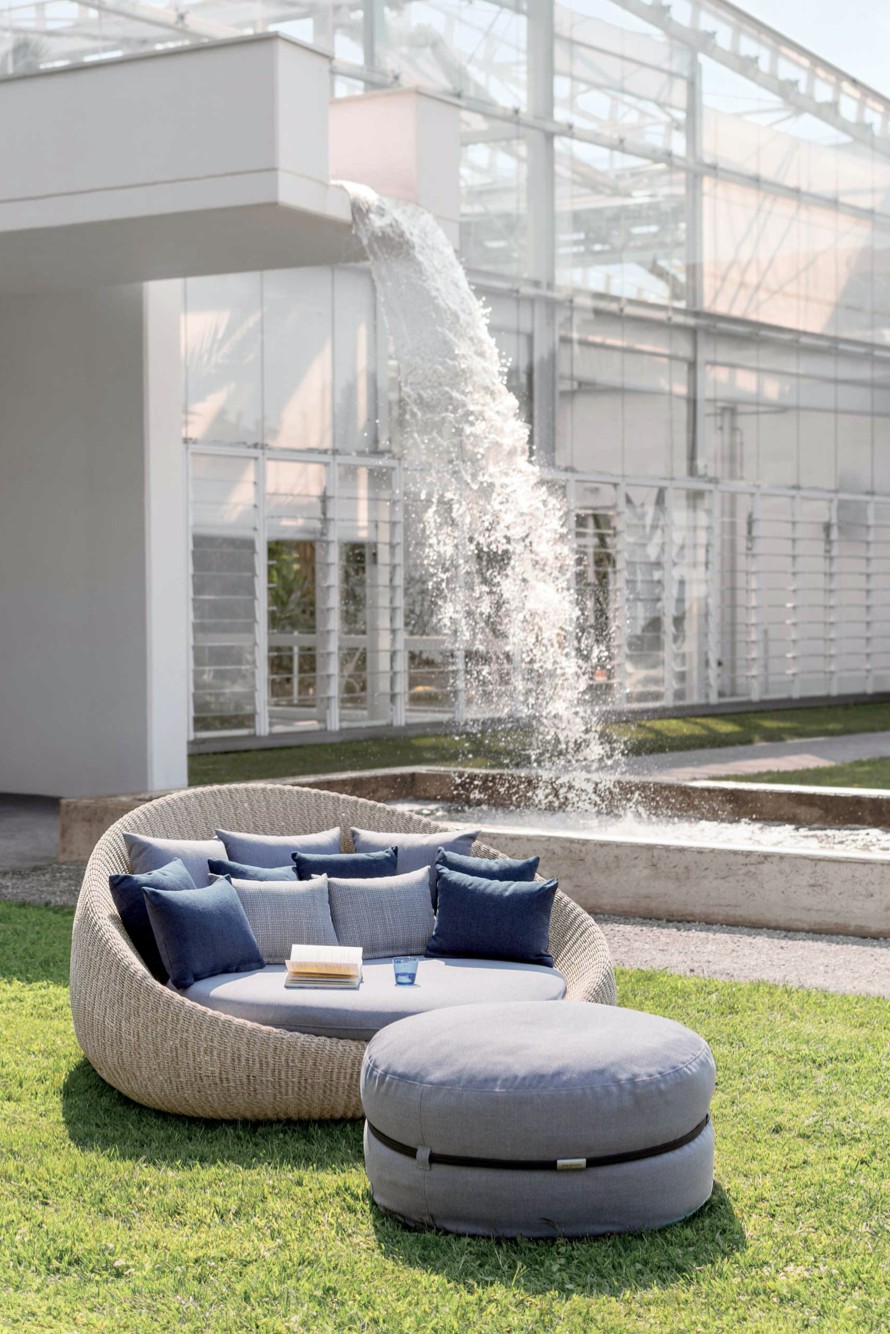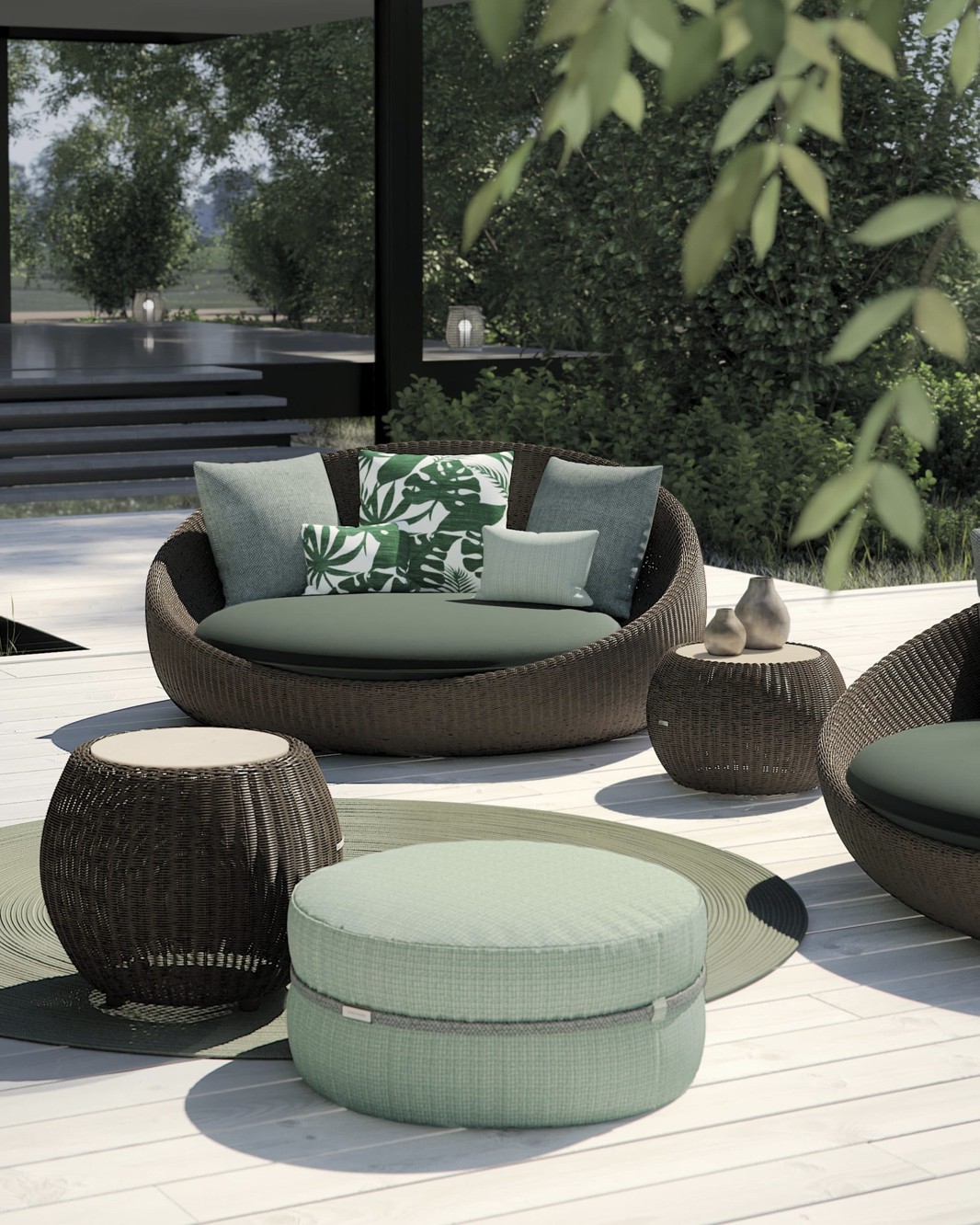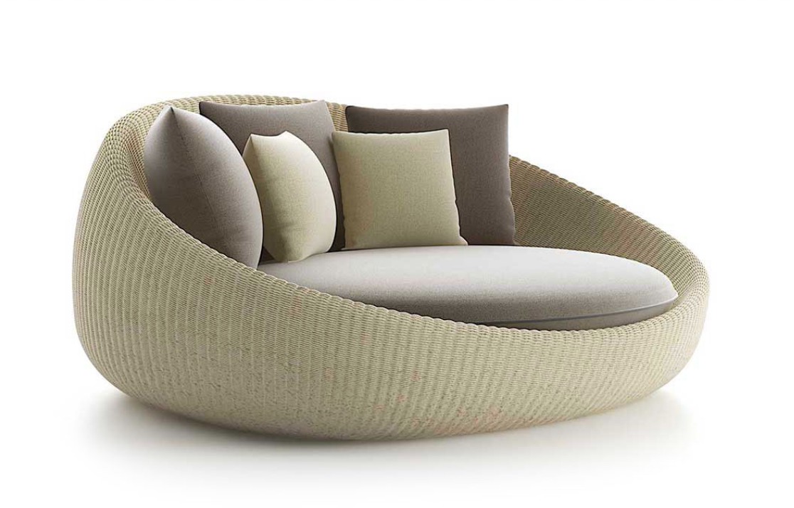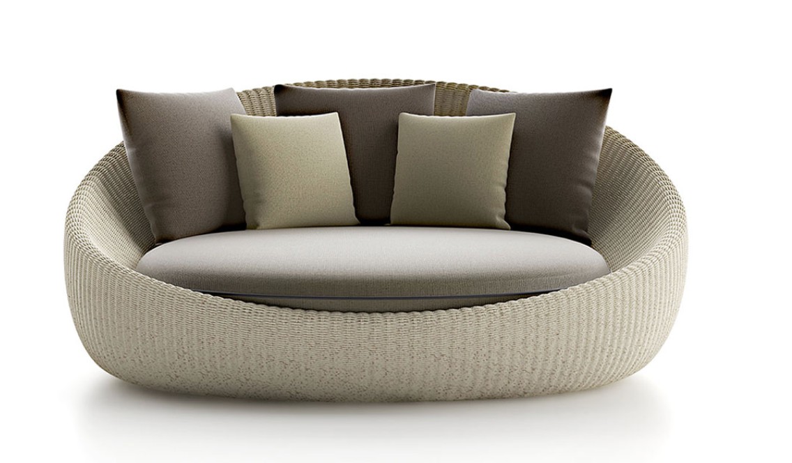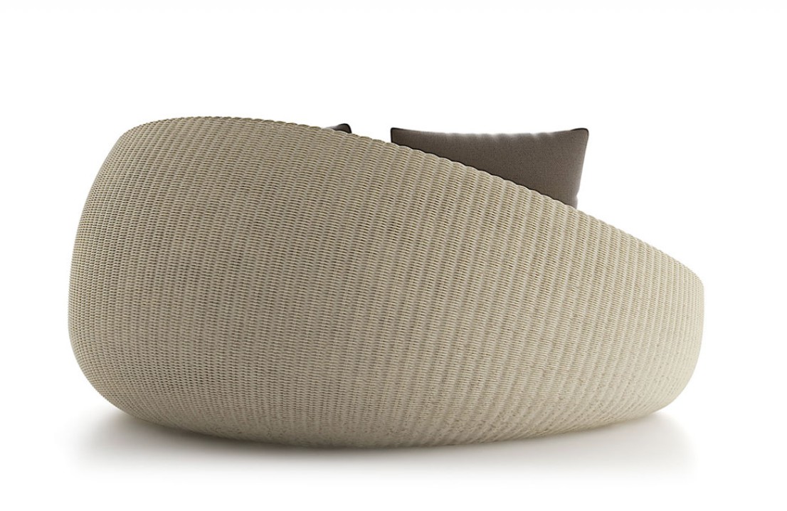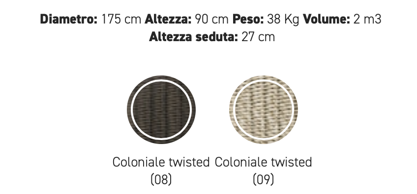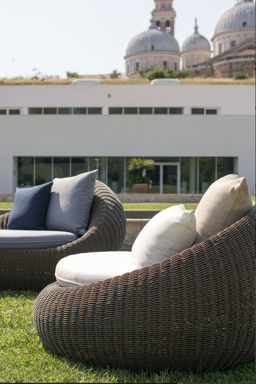 Strutture in alluminio verniciato epossidico per esterni. Intreccio in estruso di polietilene solidificato ad acqua, intrecciato a mano.