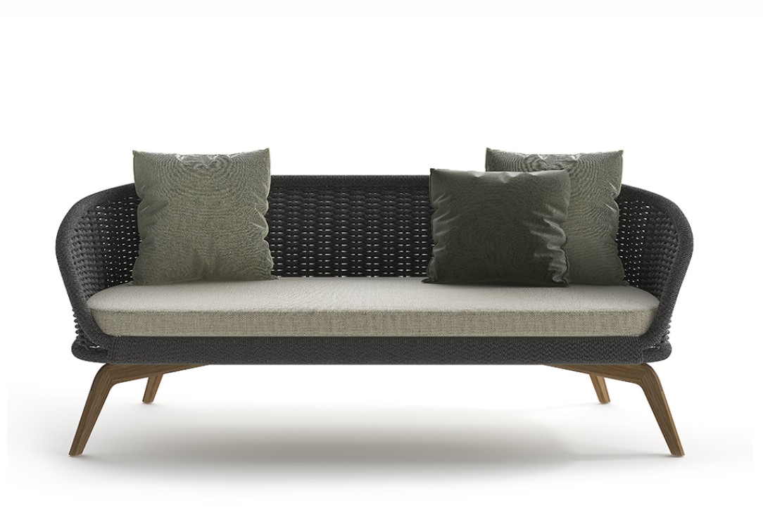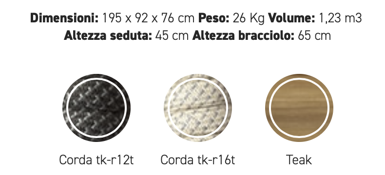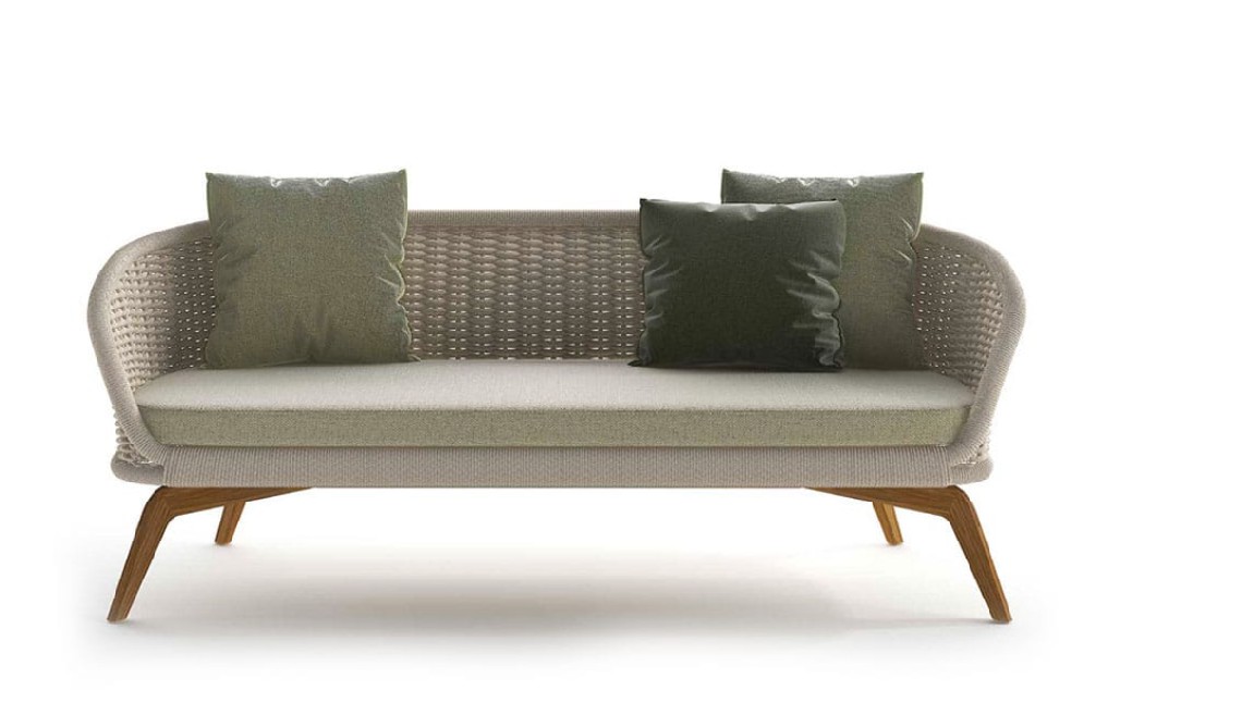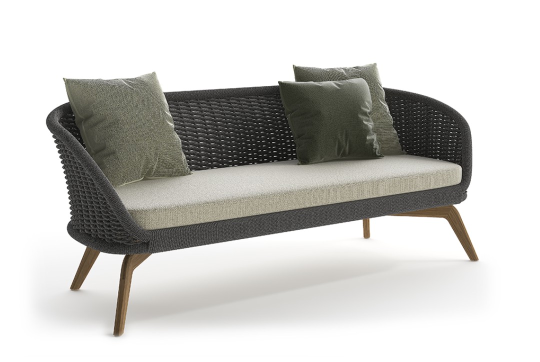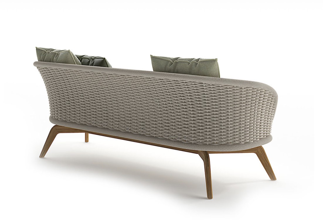 Divano con base in teak abbinata a corde intrecciate a mano in fibra acrilica di Teflon, a sezione tonda, resistenti all’acqua e di facile pulizia. Il materiale presenta un appeal morbido e raffinato simile ad intrecci tessili. Si caratterizza per la sua resistenza ai raggi UV e per la velocità di asciugatura.