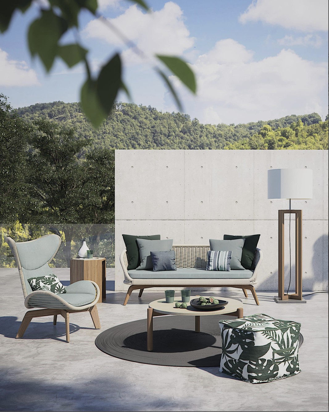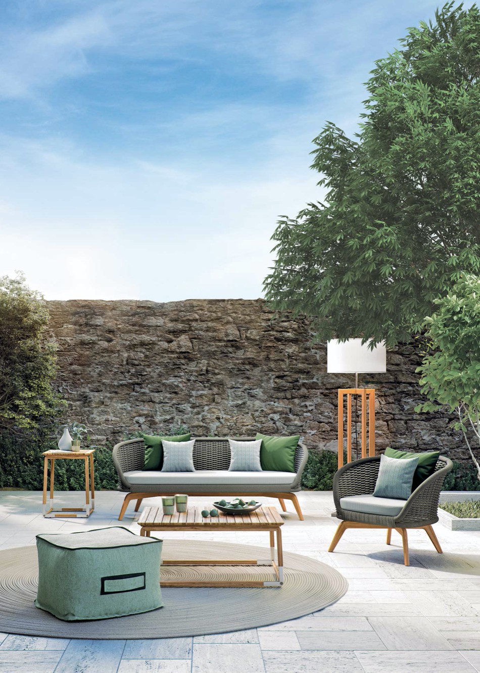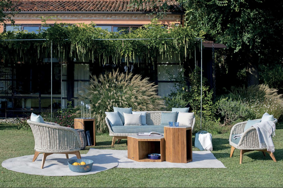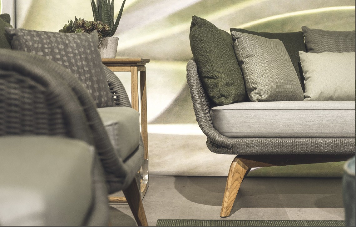 Divano con base in teak abbinata a corde intrecciate a mano in fibra acrilica di Teflon, a sezione tonda, resistenti all’acqua e di facile pulizia. Il materiale presenta un appeal morbido e raffinato simile ad intrecci tessili. Si caratterizza per la sua resistenza ai raggi UV e per la velocità di asciugatura.