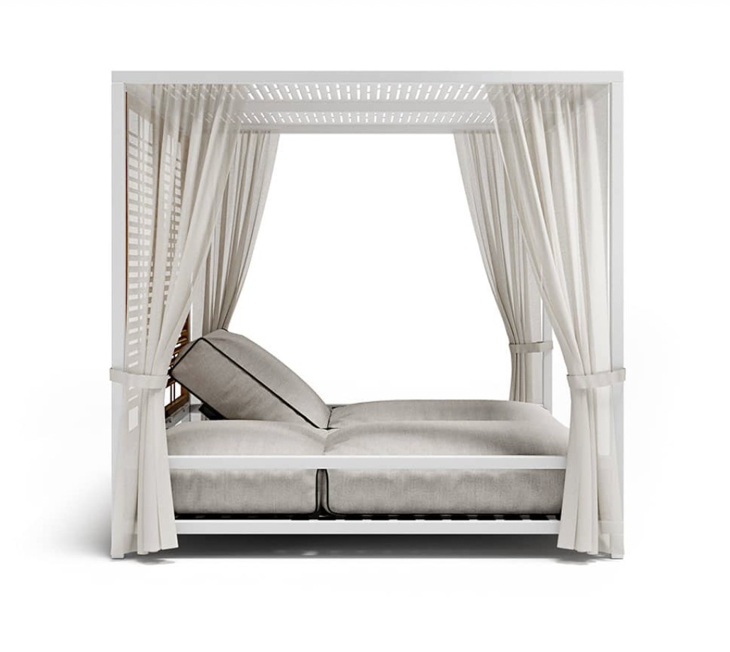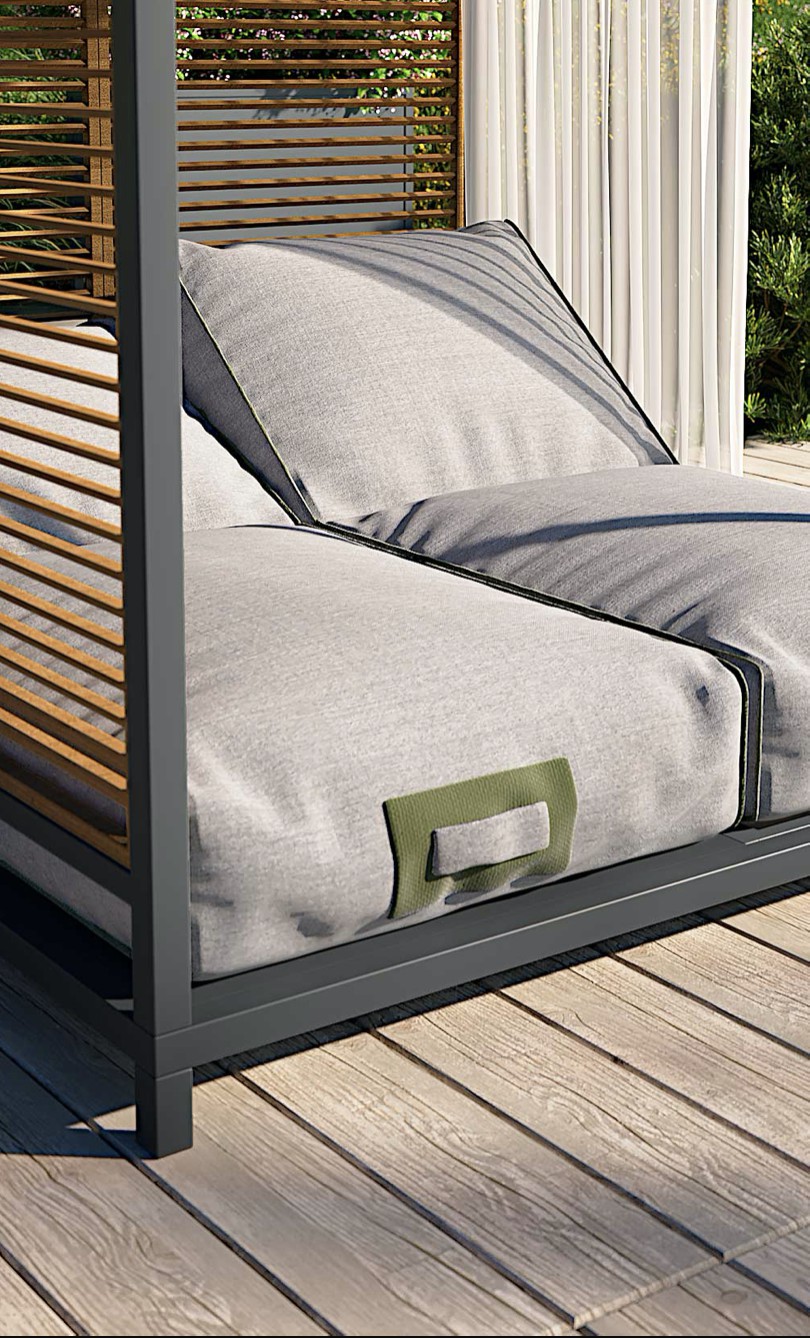 Alcova è stato progettato come uno spazio ibrido e coperto ma comunicante con l’ambiente esterno e la natura. Una struttura in alluminio robusta ma confortevole, un sistema di pannelli modulari in teak che riparano senza oscurare, una cuscinatura accogliente e ergonomica dove ritrovare una dimensione unica in cui spazio e tempo battono secondo i tuoi ritmi.