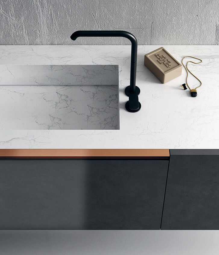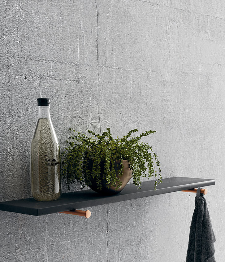 A washbasin unit with dark, intellectual nuances, thin and essential feet in burnished metal, recalling the matching Tubino light, a bright marble top coordinated with the base of the floor-standing towel rack.