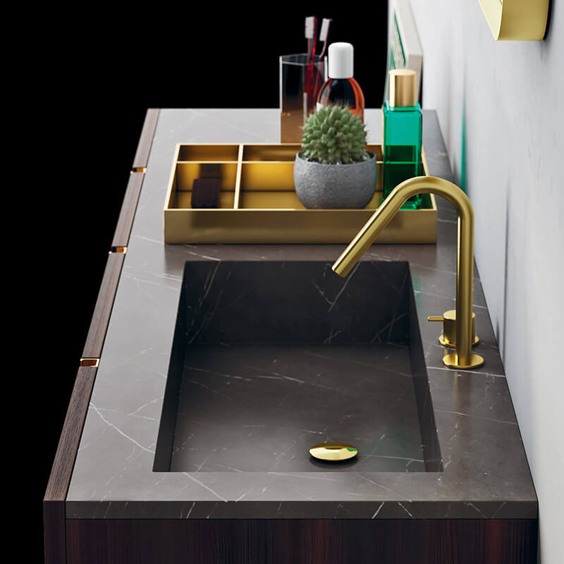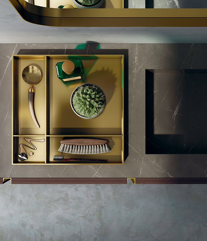 Like a precious piece of furniture, the warm and sophisticated effect of Eucalipto Termocotto envelops the wall-mounted unit, enhanced by the brilliant touch of the brass door handles. Sophisticated, classy element: the top in Pietra Grey.