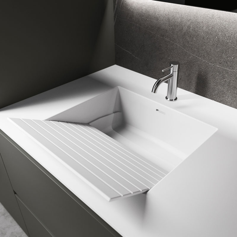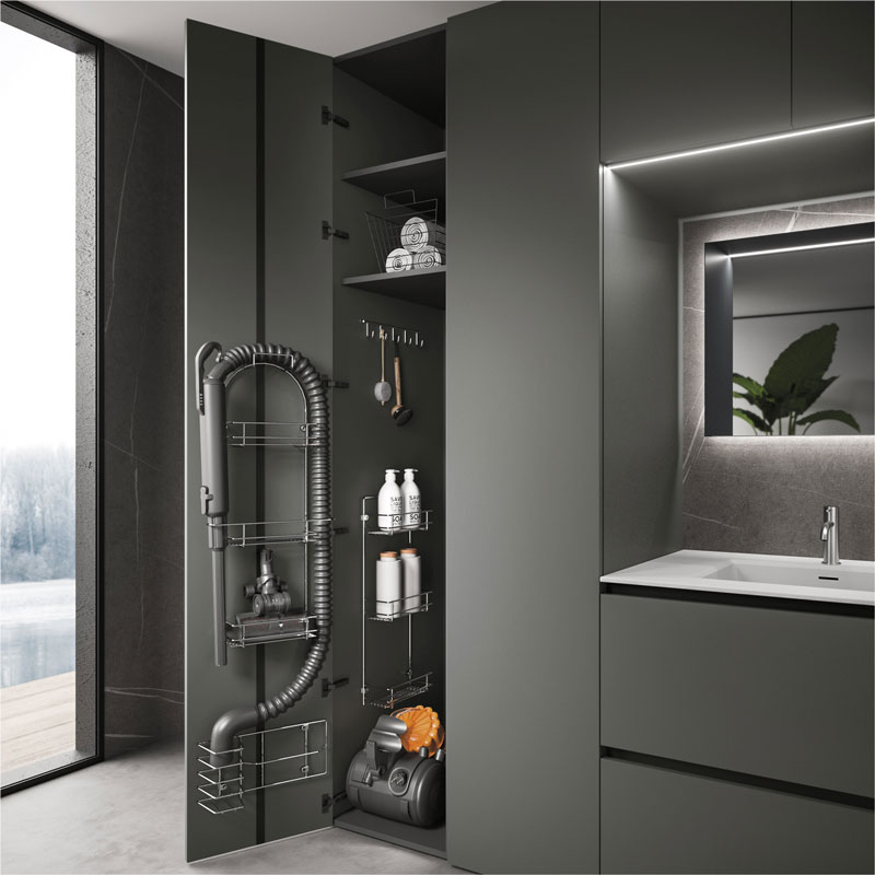 The 2-door tall unit is equipped for the installation of laundry appliances. The large pull-out laundry basket is removable to facilitate cleaning.