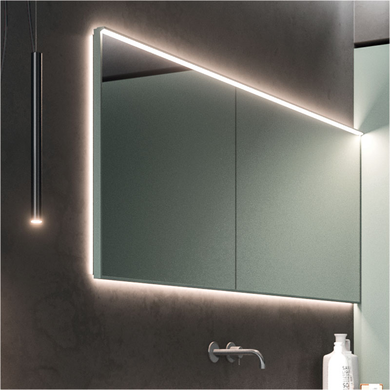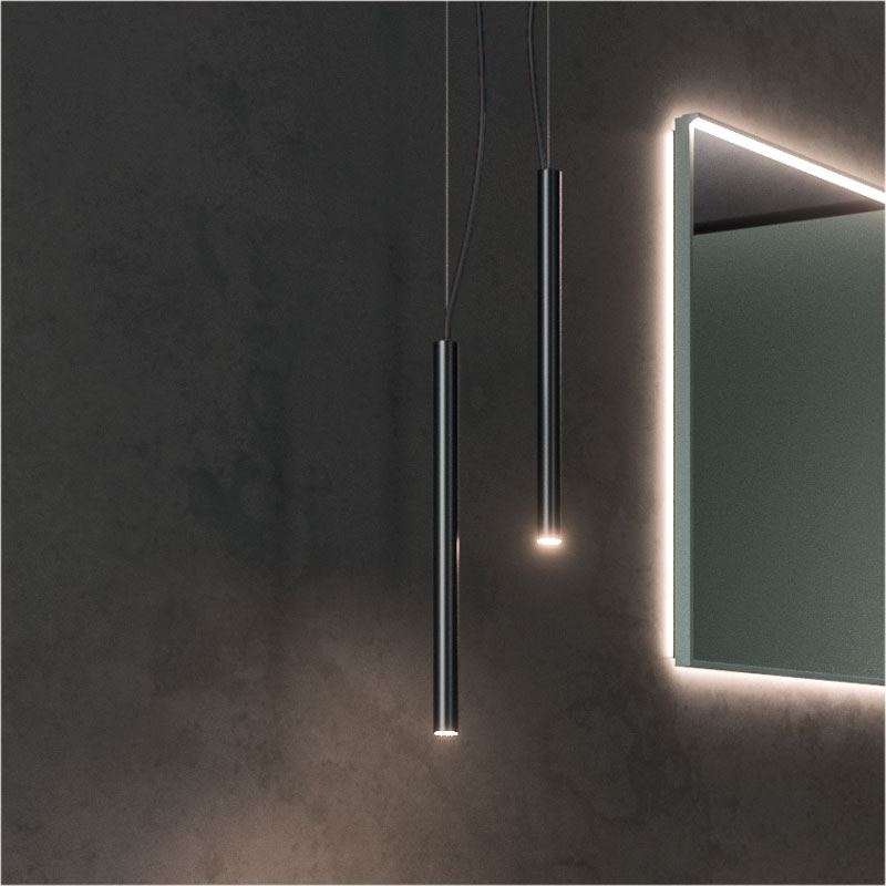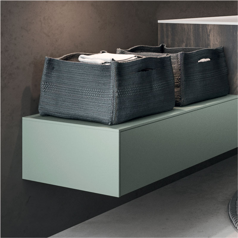 Wall-mounted base units with a two-tone Tecnomatt Verde Timo and Smoke melamine finish support the top in Koral matt white, with integrated Lavatoio basin.