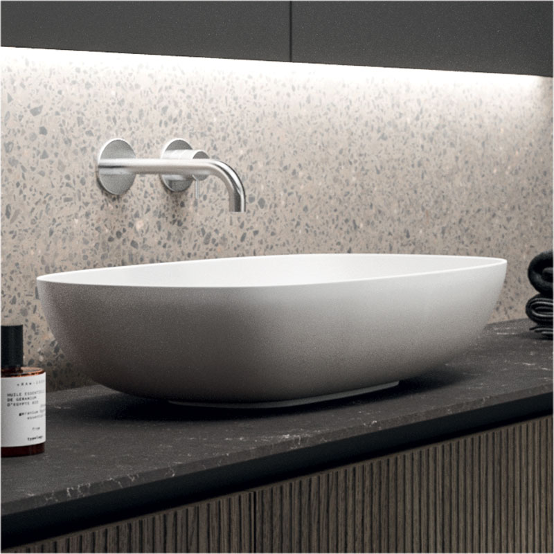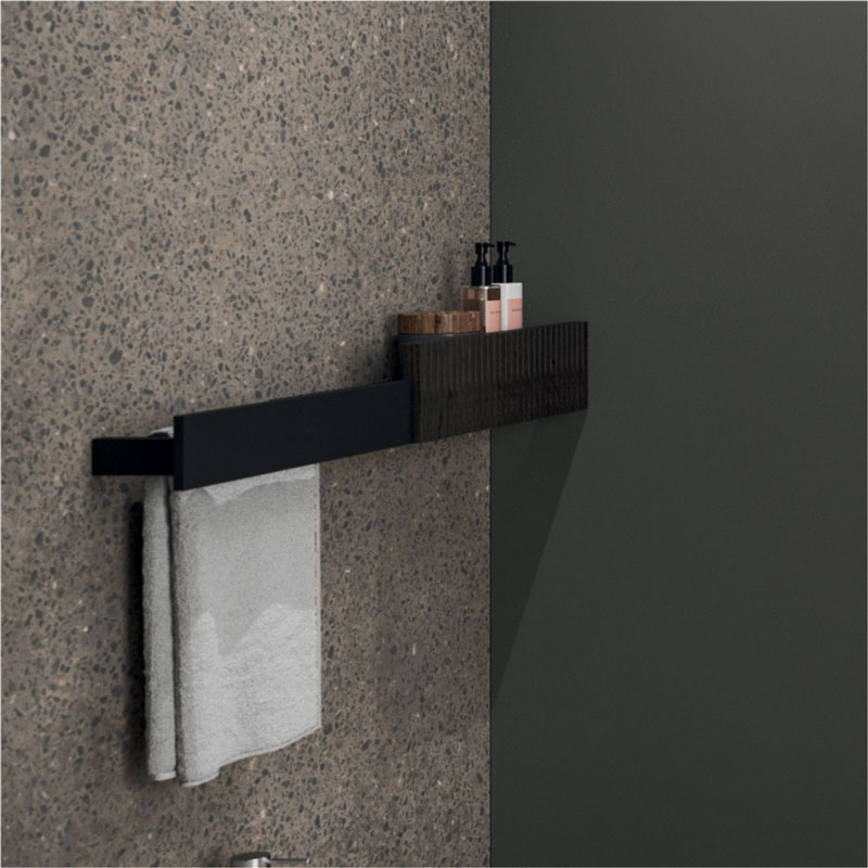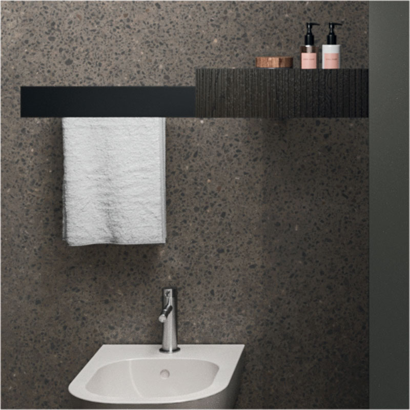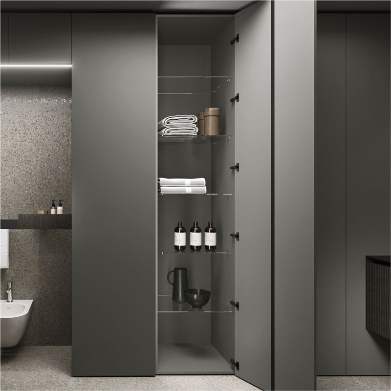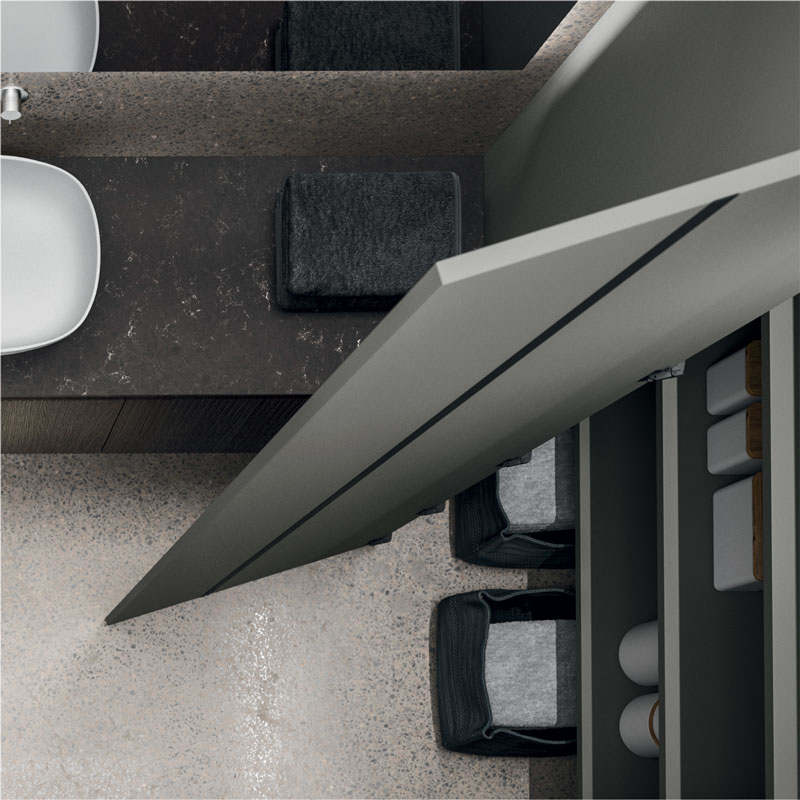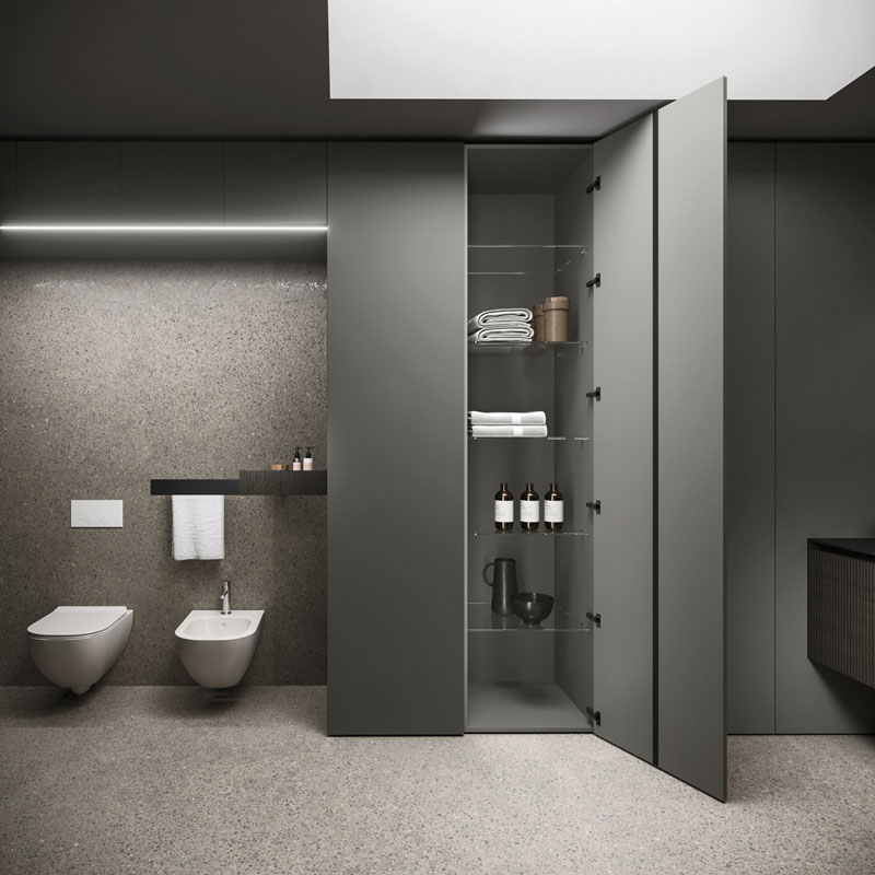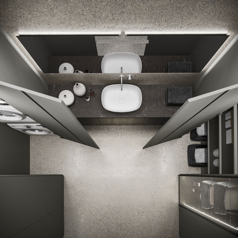 Two walk-in closets, one opposite the other, create an elegant bathroom environment but with service areas dedicated to the Laundry.