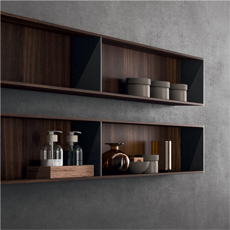 The sophisticated Rovere Termocotto characterises the wall-mounted base unit and Day Box open storage elements H24 x 150 cm.