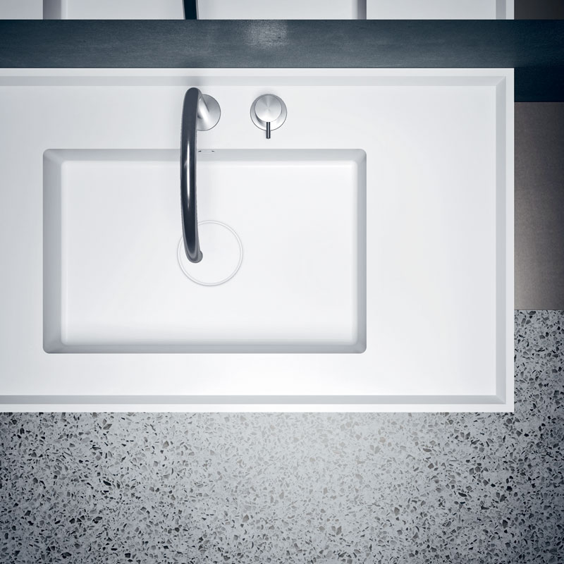 A composition dedicated to linear and orderly simplicity, horizontally developed with just three elements arranged at staggered heights. Each is a distinct volume, with its own function: top with double basin, base with pull-out drawers for storage, mirror with integrated lighting.