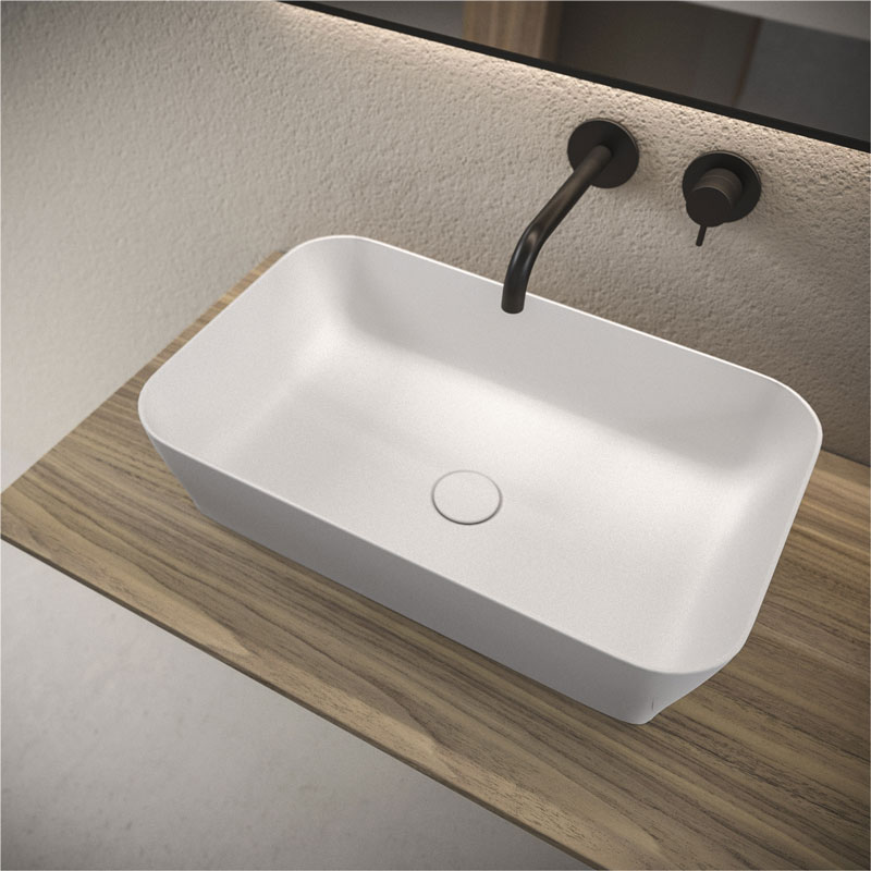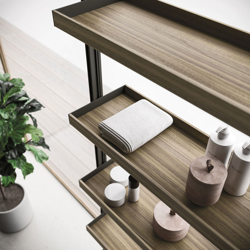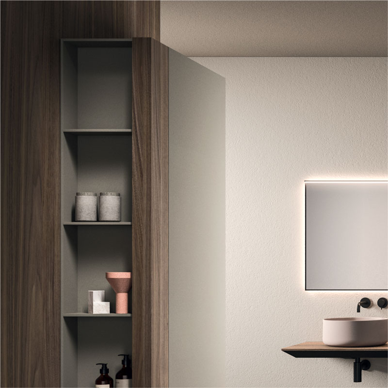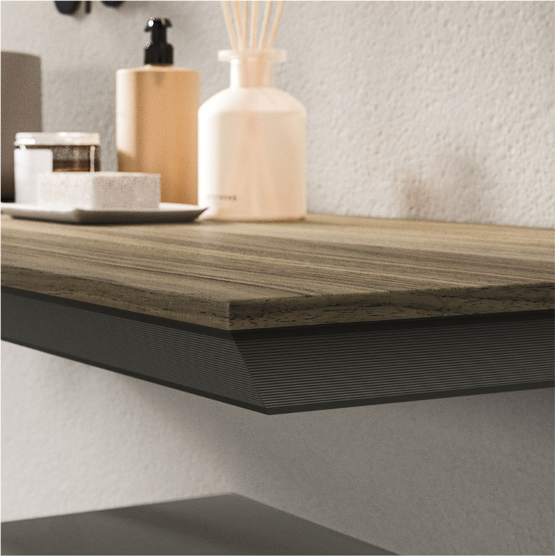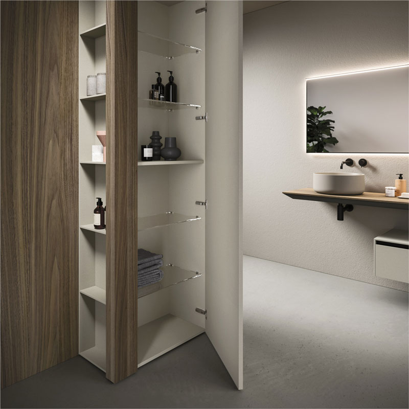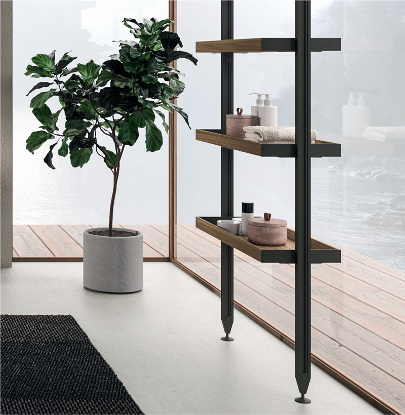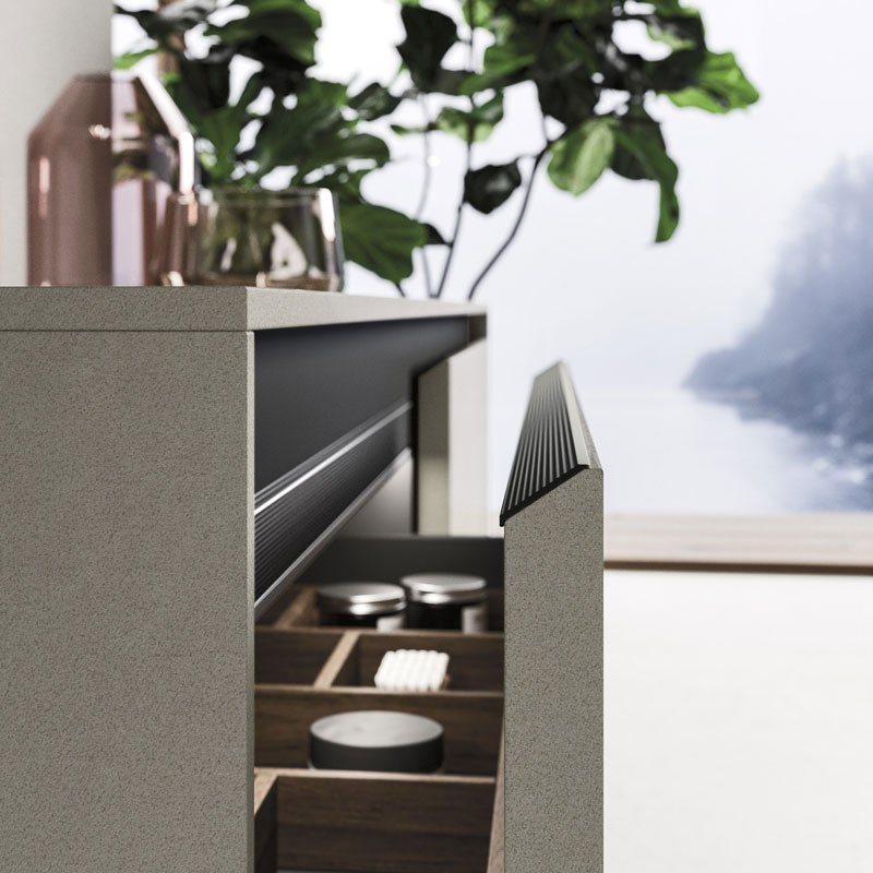 The characteristic Alu-Top aluminium frame with 45° section, with no visible joints, slims the composition down supporting a 12 mm thick top.