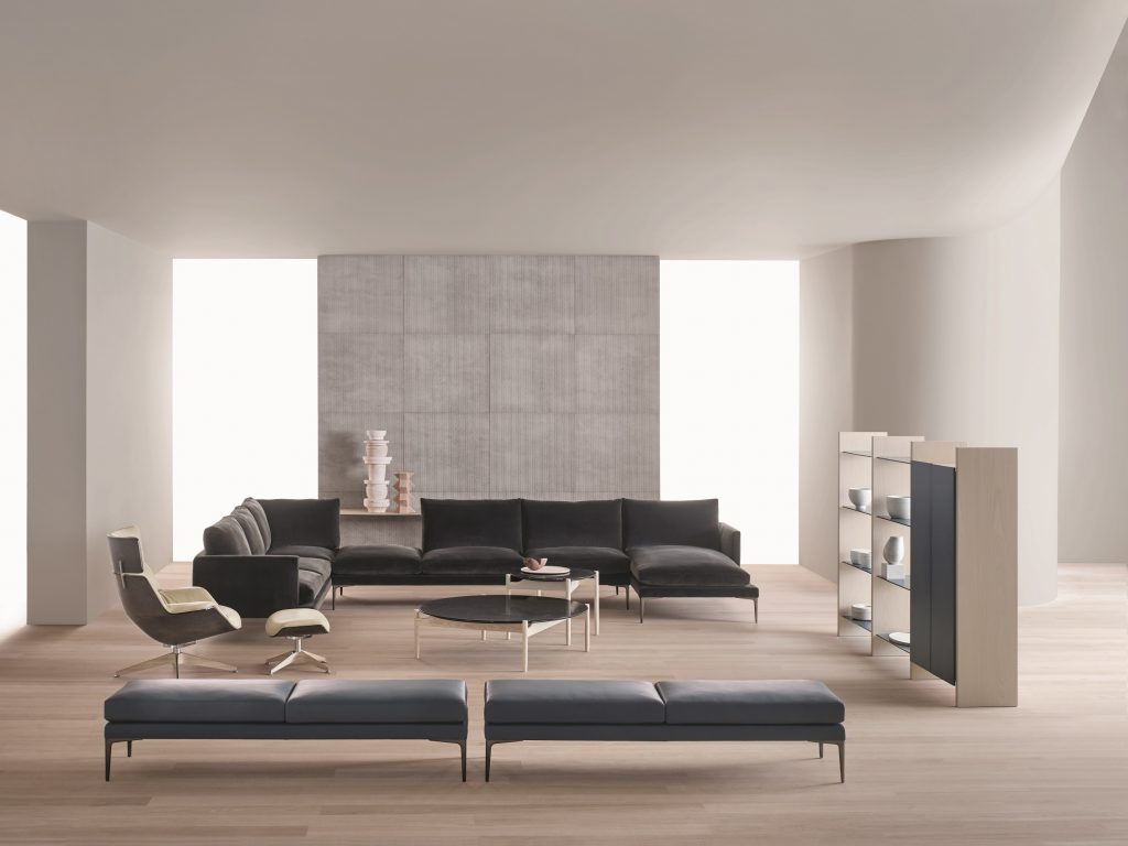 è rigoroso nelle sue linee che alternano angoli retti e curve, per migliorare il senso della morbidezza e successivamente il senso del comfort. Maggiore impatto è dato dalla base metallica che conferisce un aspetto minimalista all’intero progetto.