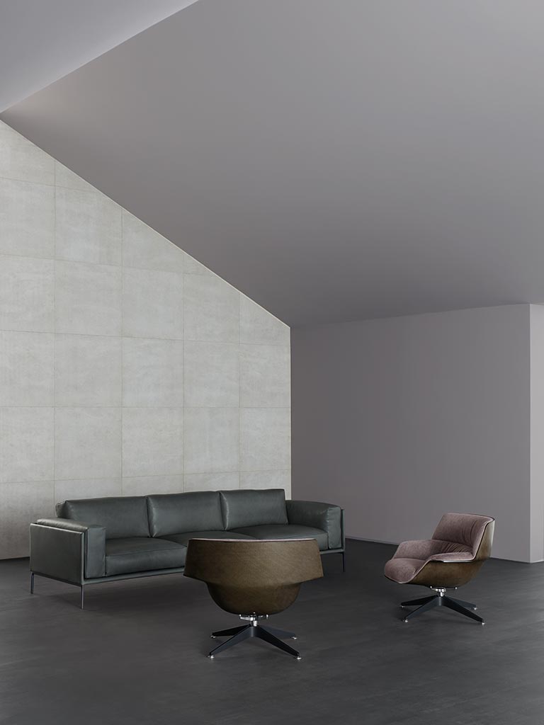 Una scocca rigida e regolare, accoglie sedute e spalliere morbide e avvolgenti.
