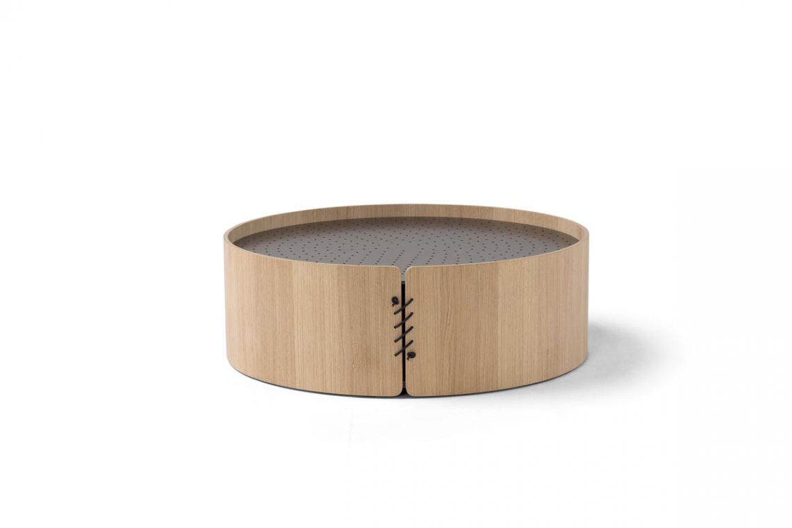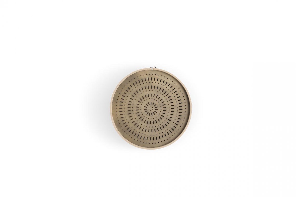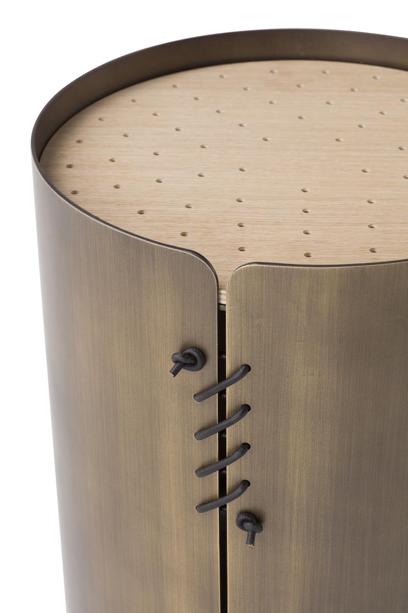 Così, a caratterizzare i modelli è un piano d’appoggio traforato in lamiera, in legno o in cuoio; tradizionalmente i setacci avevano pattern di traforo diversi, qui rielaborati e proposti per dare vita a complementi dalla personalità unica. La base può essere realizzata in legno, metallo o cuoio ed è composta da un’unica superficie curvata e chiusa da cuciture in cuoio. La superficie traforata del piano d’appoggio rende questo set particolarmente versatile.