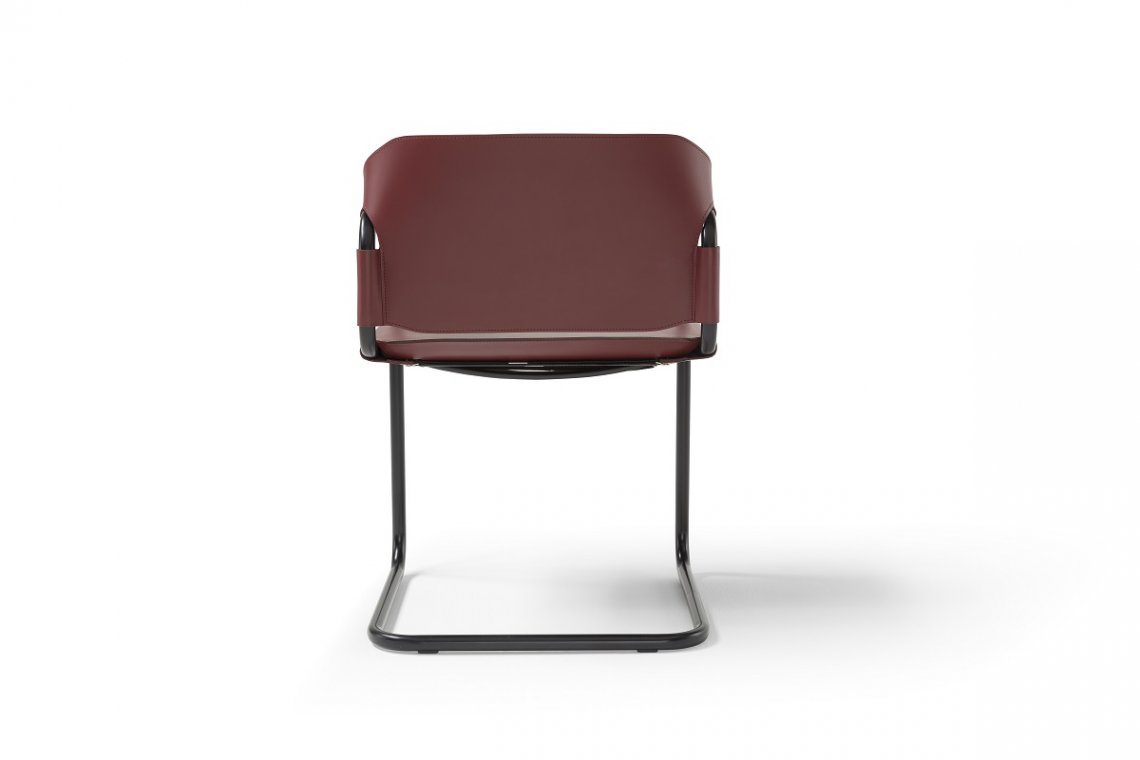 Una cintura sostiene lo schienale, agganciandosi sui braccioli, mentre un morbido dettaglio é disegnato dalla pelle che ricade sulla parte anteriore della seduta, permettendo di nascondere la sbarra trasversale di rinforzo.