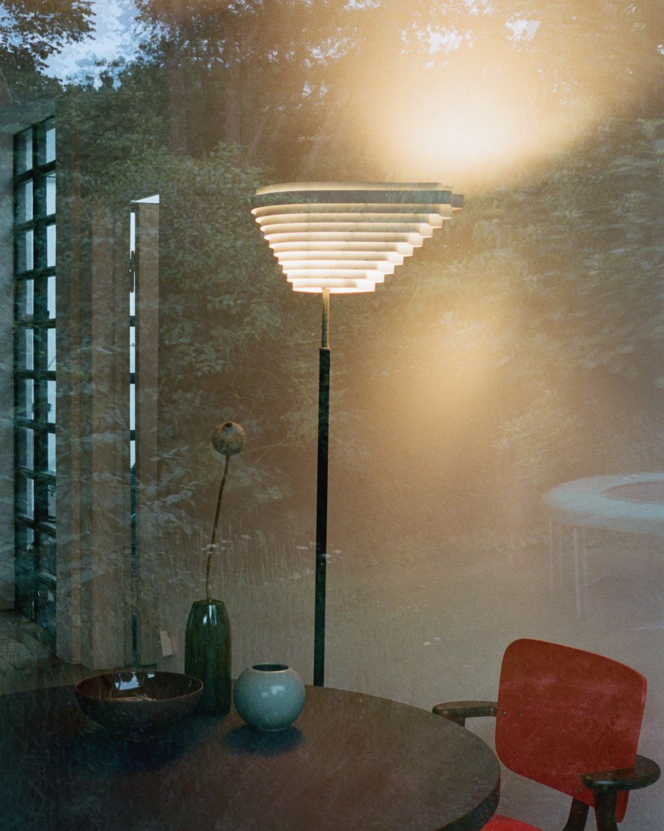 落地燈A805具有手工鉚接的燈罩,該燈罩由精致的帶漆金屬條制成。 它呈現(xiàn)直線和曲線的驚人組合,同時允許直接和間接光之間有趣的相互作用。 拋光的黃銅項圈與白色陰影形成鮮明的對比,支架的黑色皮革表面在芬蘭手工縫制。 不對稱的形狀讓人聯(lián)想到天使的翅膀,因此有個綽號。 “天使之翼”是阿爾瓦·阿爾托(Alvar Aalto)在1954年為赫爾辛基國家養(yǎng)老金研究所設計的。