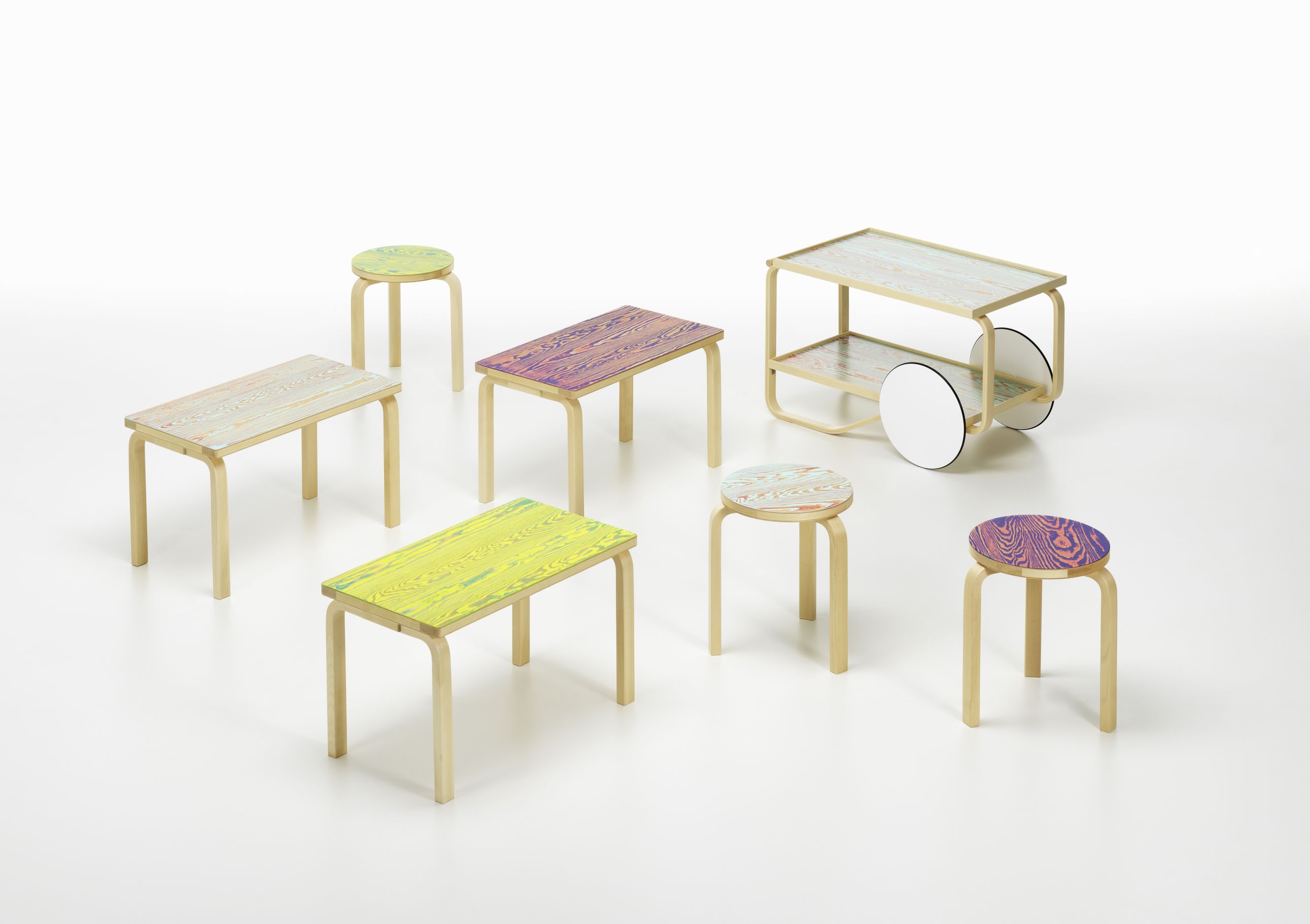 Jo Nagasaka的新穎傳統(tǒng)手工藝以其新穎和現(xiàn)代的表現(xiàn)而聞名。因此,總部位于東京的建筑師和設(shè)計(jì)師是Artek的FIN / JPN友誼收藏的自然伴侶。長(zhǎng)坂(Nagasaka)著手將他在表面處理方面的研究應(yīng)用到Artek最受歡迎的經(jīng)典作品中。 Nagasaka嘗試了Udukuri和Tsugaru-nuri的古老做法,將它們合并到自己的原始流程中,從而產(chǎn)生了他所說(shuō)的ColoRing。對(duì)于ColoRing,軟木松木用作表面貼面。長(zhǎng)坂通過(guò)用硬毛刷去除較軟的部分,從而突出木材的天然紋理(Udukuri),從而使木材表面不平坦。然后添加兩層有色漆,隨后將其打磨以部分暴露下面的層(Tsugaru-nuri)。結(jié)果是令人驚訝的顏色組合和不規(guī)則的圖案,讓人聯(lián)想起地形圖。保留部分可見(jiàn)的木制結(jié)構(gòu),保留自然美景,同時(shí)創(chuàng)造出迷人的并列感。為了生產(chǎn)ColoRing系列,Artek將這些傳統(tǒng)上完全手工的技術(shù)轉(zhuǎn)化為半工業(yè)工藝,從而使該系列能夠帶給更多的聽(tīng)眾。使用ColoRing技術(shù)處理過(guò)的Stool 60,Bench 153B和Tea Trolley 901在芬蘭制造,在世界范圍內(nèi)都有銷售。