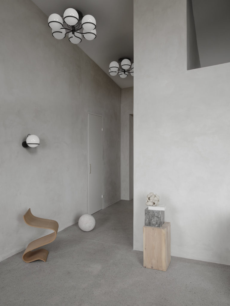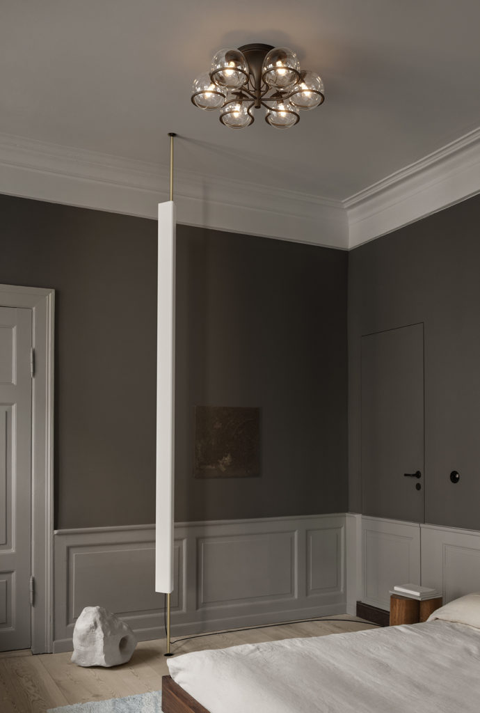 With Le Sfere Plafone, Model 2042/6 from 1963, another of Gino Sarfatti’s beautiful interpretations of the luminous sphere is reintroduced. The refined ceiling light is composed of six blown opaline glass spheres supported by a painted steel mount and structure with a Black or Champagne finish. Each sphere measures 20 cm in diameter and is gently held in place by the painted steel ring in a refined embrace that lends the luminaire a graphic expression and brings forth Le Sfere’s distinctive aesthetic.