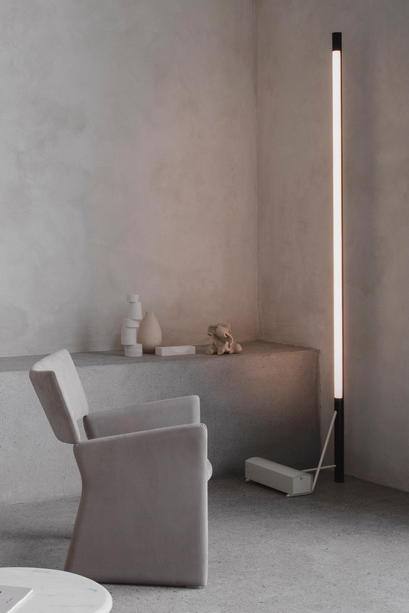 Emitting direct or reflected light, the floor lamp is composed of a thin black or white- painted aluminium tube, which houses the light source. The aluminium base is balanced by an aluminium box, a rounded rectangular section that contains the power supply. The two parts are connected via two steel rods arranged in an unusual off-centre position that appears to estrange them from each other while at the same time lending the luminaire a sense of equilibrium in a seemingly magical way.