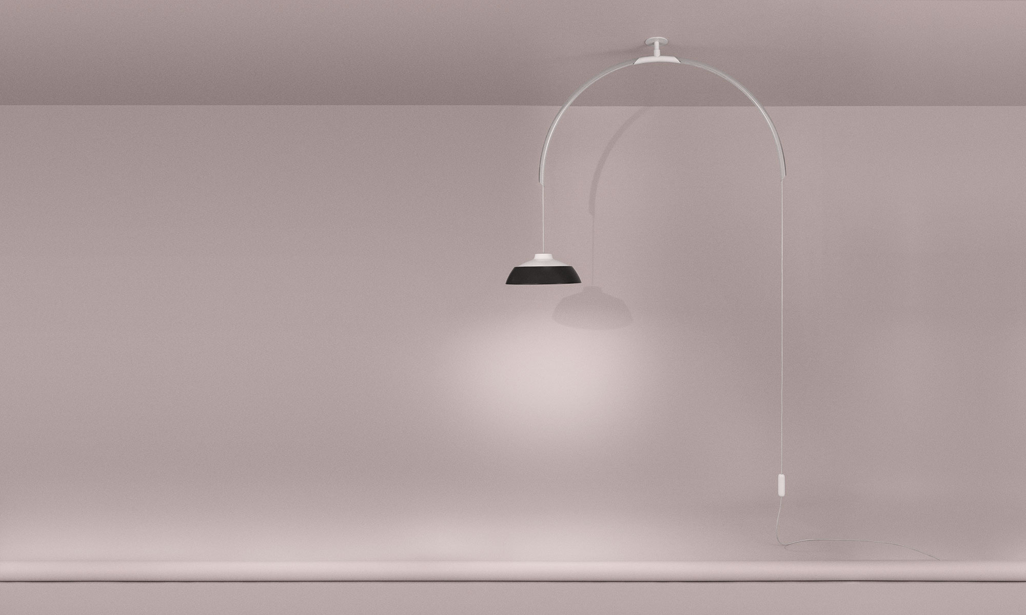 The intimate light provided by Model 2129 wraps the space in a warm ambience. The luminaire features a discreet counterweight and a large arc-shaped arm in transparent methacrylate that is attached to the ceiling and able to rotate 360 degrees horizontally. The cup-shaped reflector is made of two lathed aluminium pieces painted white and caviar grey. Both the dowel for the ceiling fitting and the counterweight are made of painted brass.