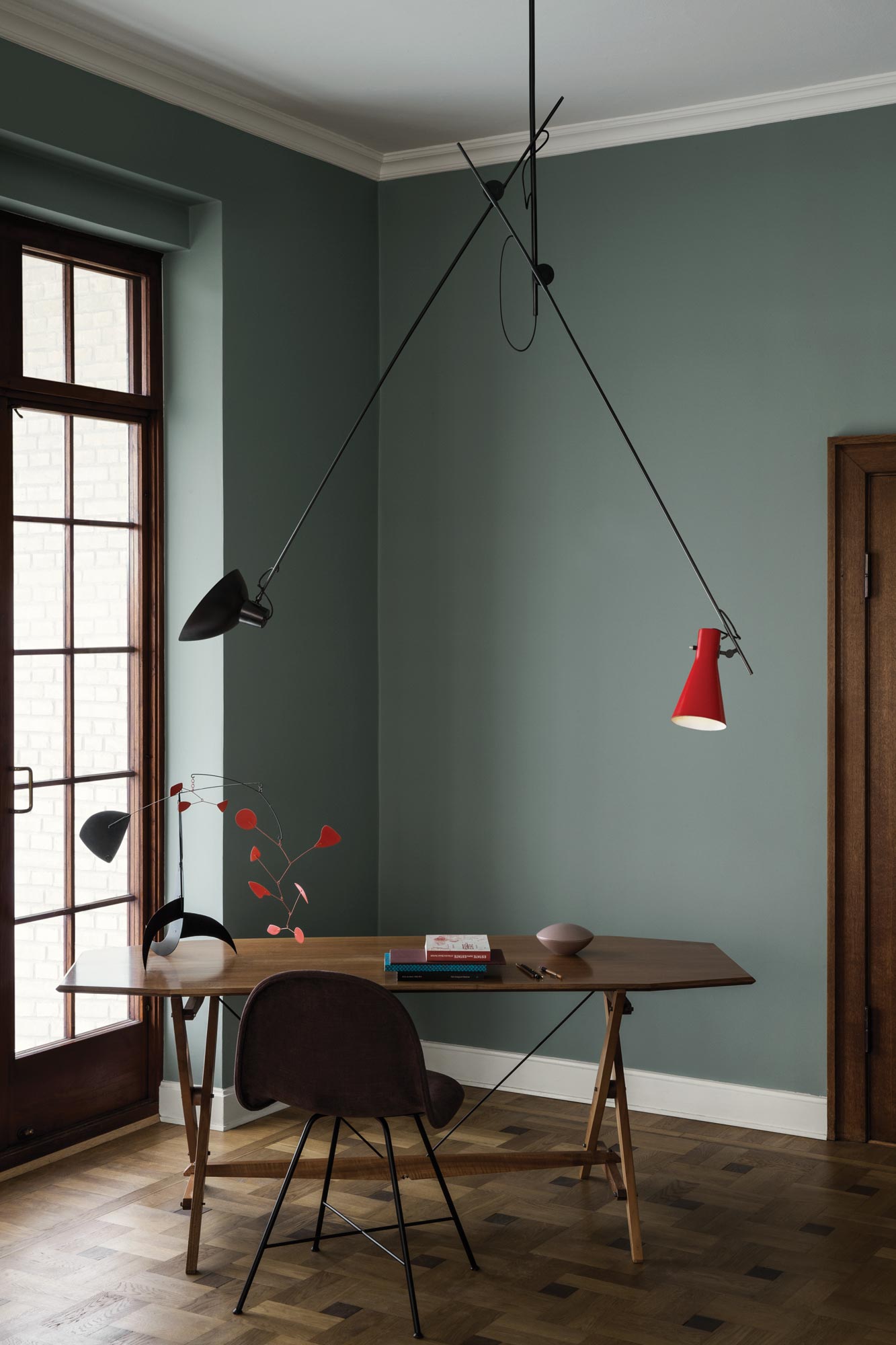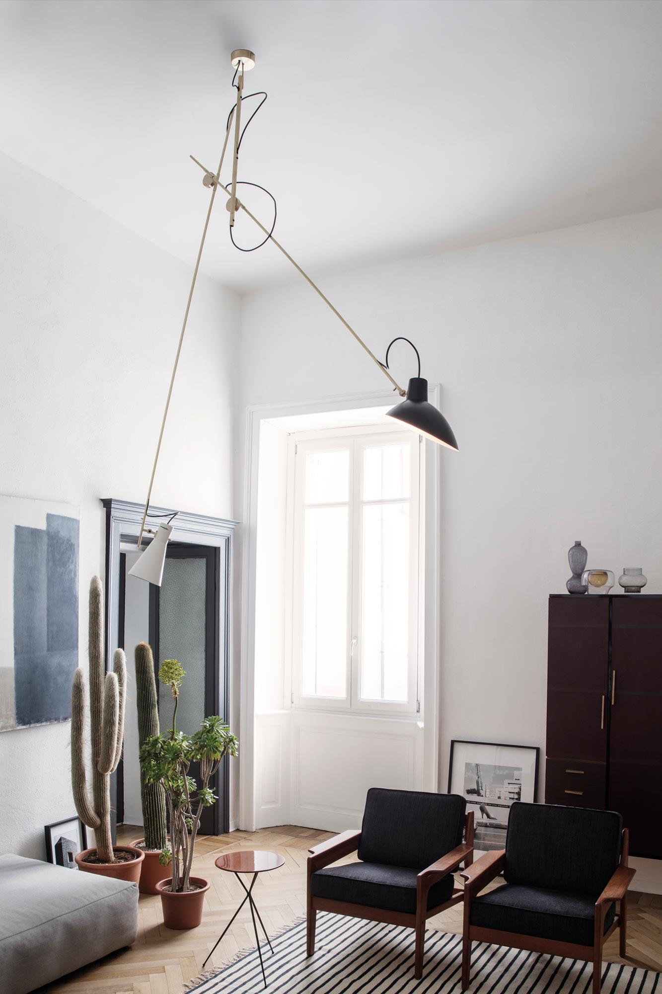 The Suspension model is a sophisticated luminaire with a distinctive dual-stemmed construction. It is a type of kinetic object constructed to take advantage of the principle of equilibrium, therefore the central pole might find its equilibrium in a way which is not perpendicular to the ceiling. The invitingly playful design encourages dynamic lighting compositions. The fixture and the reflectors can be adjusted to many different positions, enabling a wide variety of both downward and upward lighting.