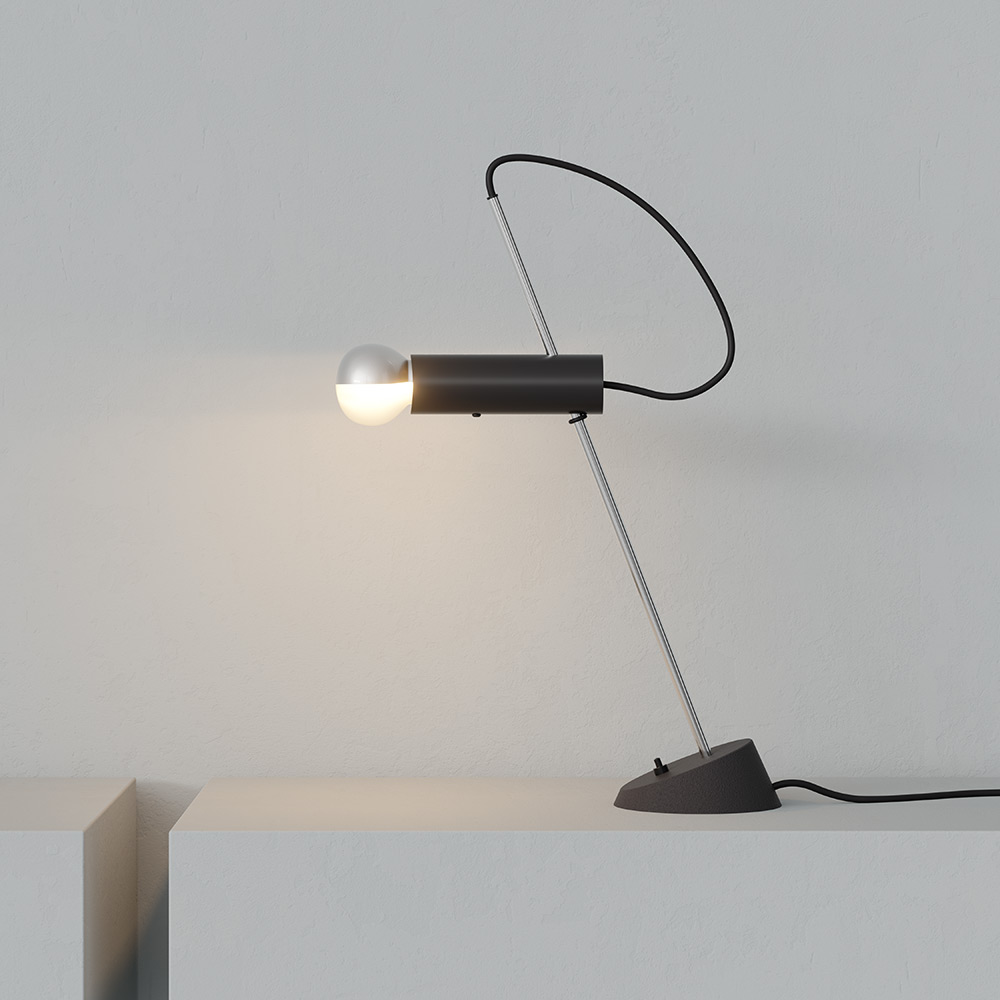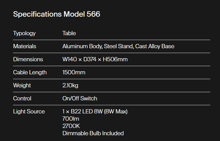 Designed in 1956, the Model 566 embodies Gino Sarfatti’s reductive process, resulting in a balanced elemental form. The luminaire stands poised, with implied forward motion, lightening the contrasting body tube which holds the characteristic Cornalux bulb. The body tube is cleverly supported by a simple rubber ring that provides the perfect amount of friction for infinite adjustability. The base, originally made of cast-iron, is now made from an alloy of aluminium, magnesium, and copper, which provides better resistance to corrosion, produces no air pollution during production, and is recyclable. Punctuating the design, a familiar push-button on/off switch is incorporated in the base, providing a satisfying click.